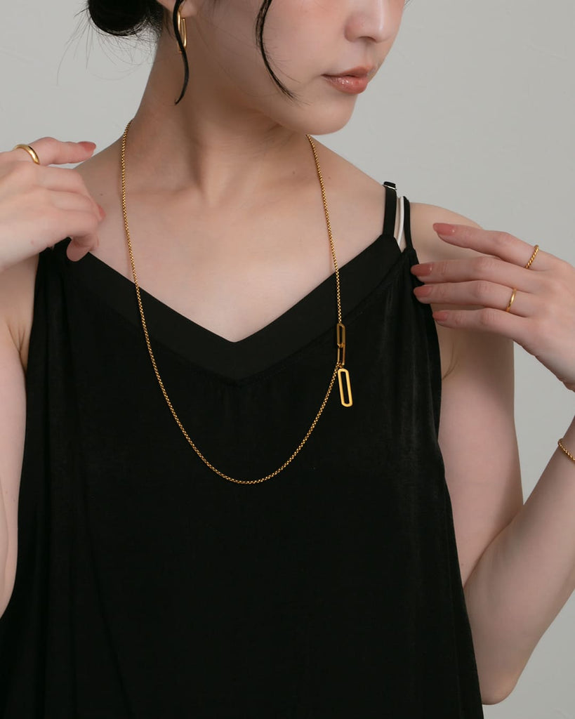シンプルながらも個性的なシルエットが目を引く、ラウンドレクタングルモチーフのロングネックレス。