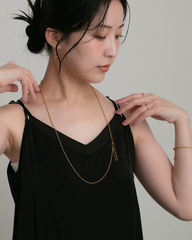 全長約70cmのロングチェーンが、胸元にすらりと縦のラインを作り、コーディネートをすっきりとした印象に。