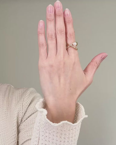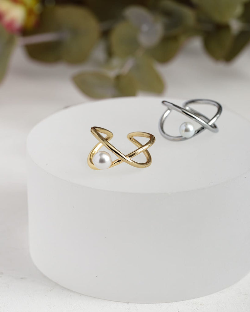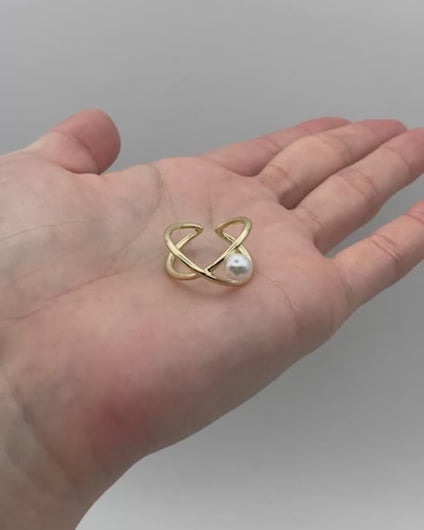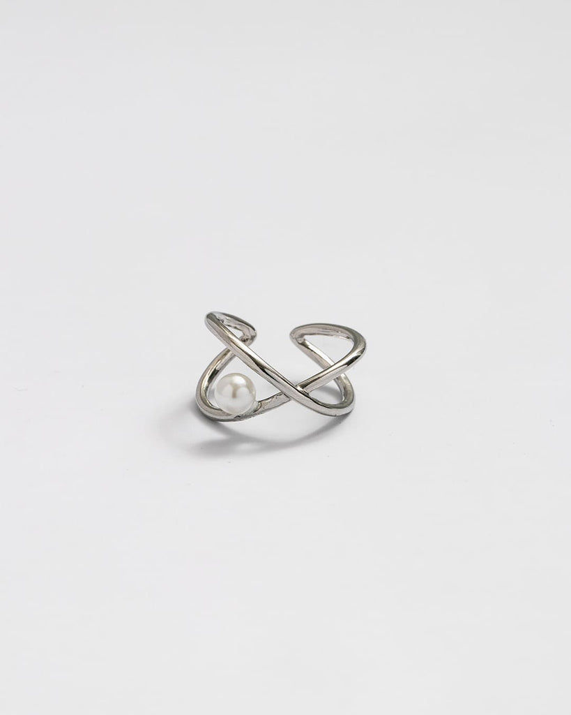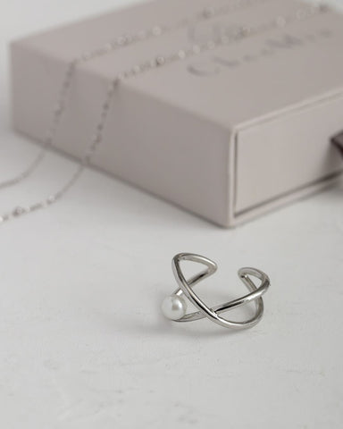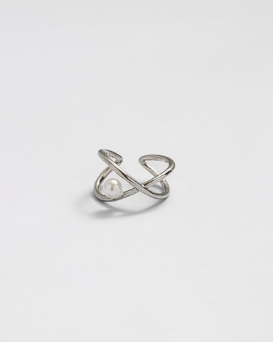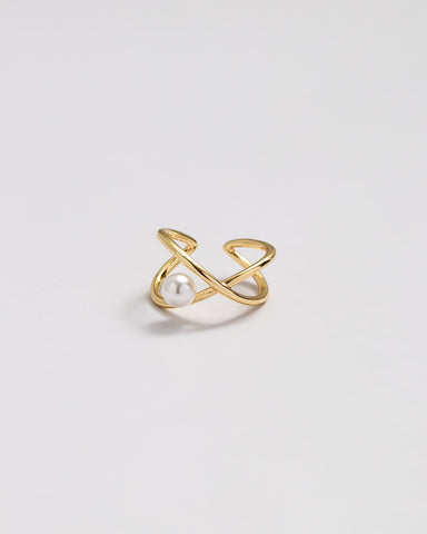 立体的にクロスするラインに、ころんと添えたパールが目を惹くリング。
