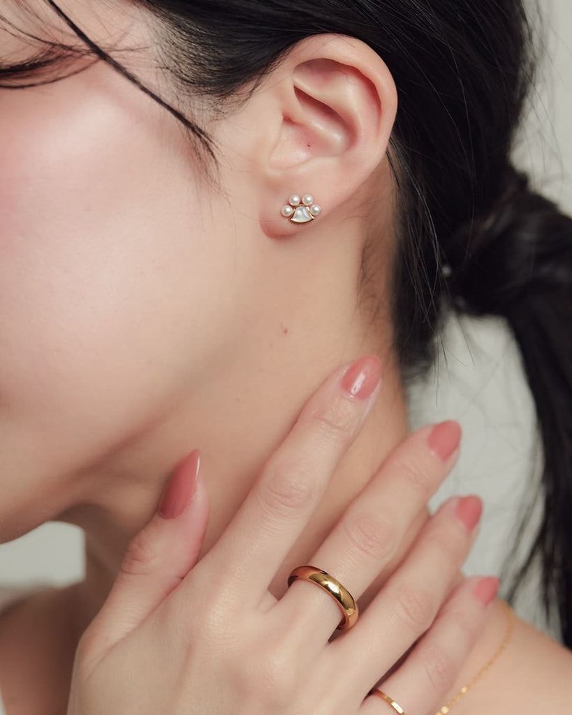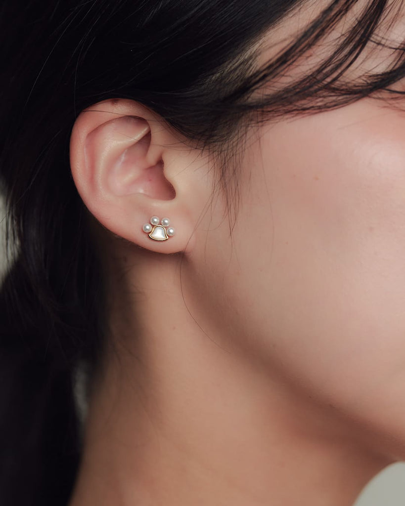 ぷっくりとした4粒のパールがころんと並び、中央のパーツがつやんと輝きを添える肉球モチーフのピアス。