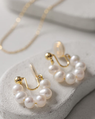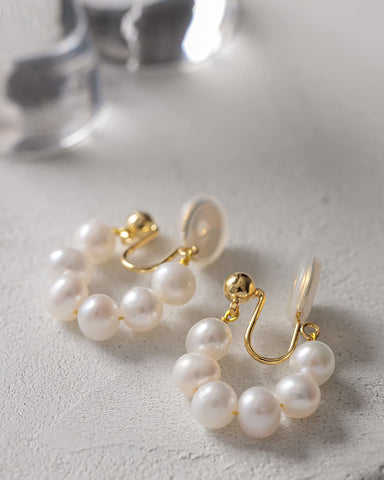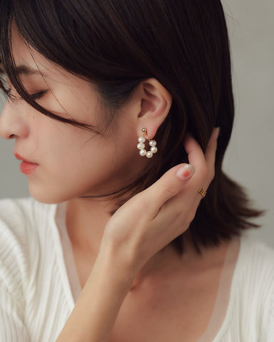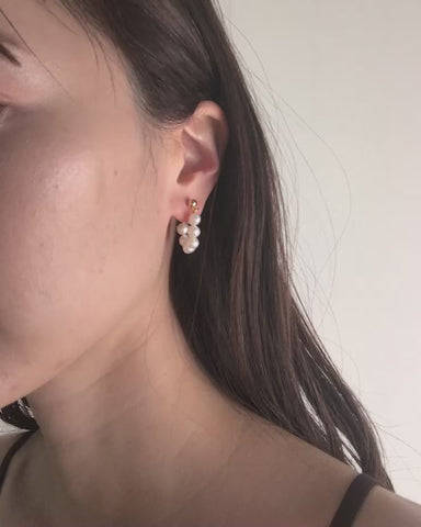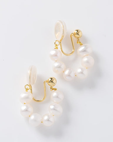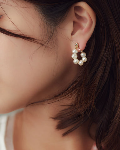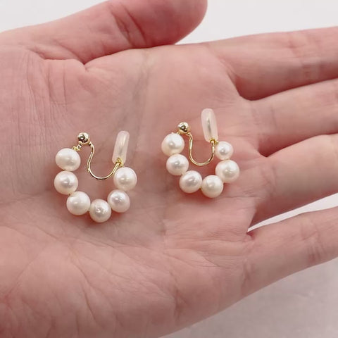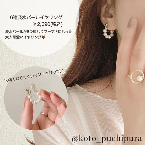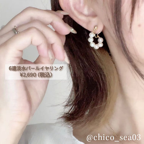約6mmの大粒淡水パールが6つ連なりフープ状になったデザインのイヤリング。