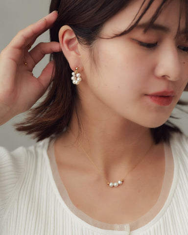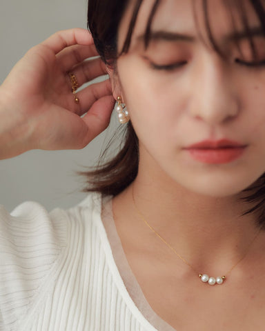 1粒ずつ表情の違う淡水パールを使用することで、きちんとした印象になりすぎないため、カジュアルなスタイルにも合わせやすく普段使いにぴったりです。