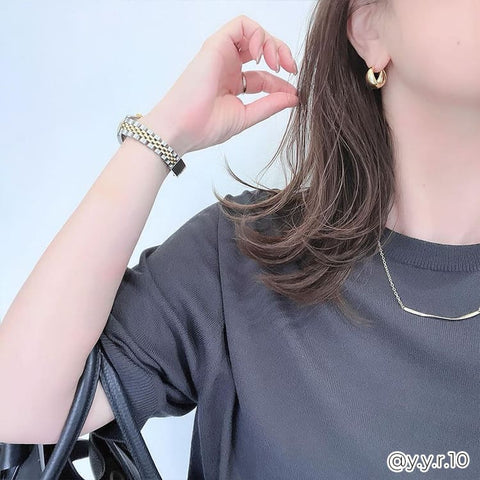 シンプルなトップスにも、ドレッシーな装いにも馴染む万能デザインです。
