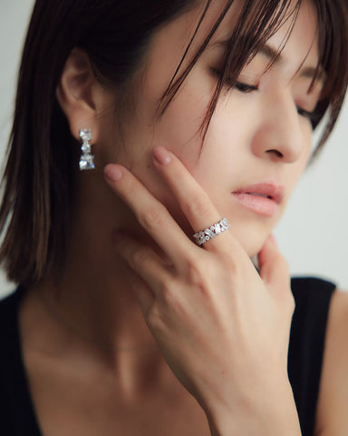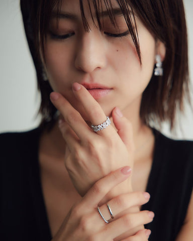 ラウンドとスクエア、異なるカットのストーンを組み合わせることで、光の反射に奥行きが生まれ、単色でも十分に華やかな印象。