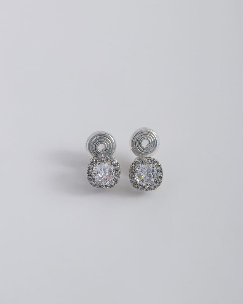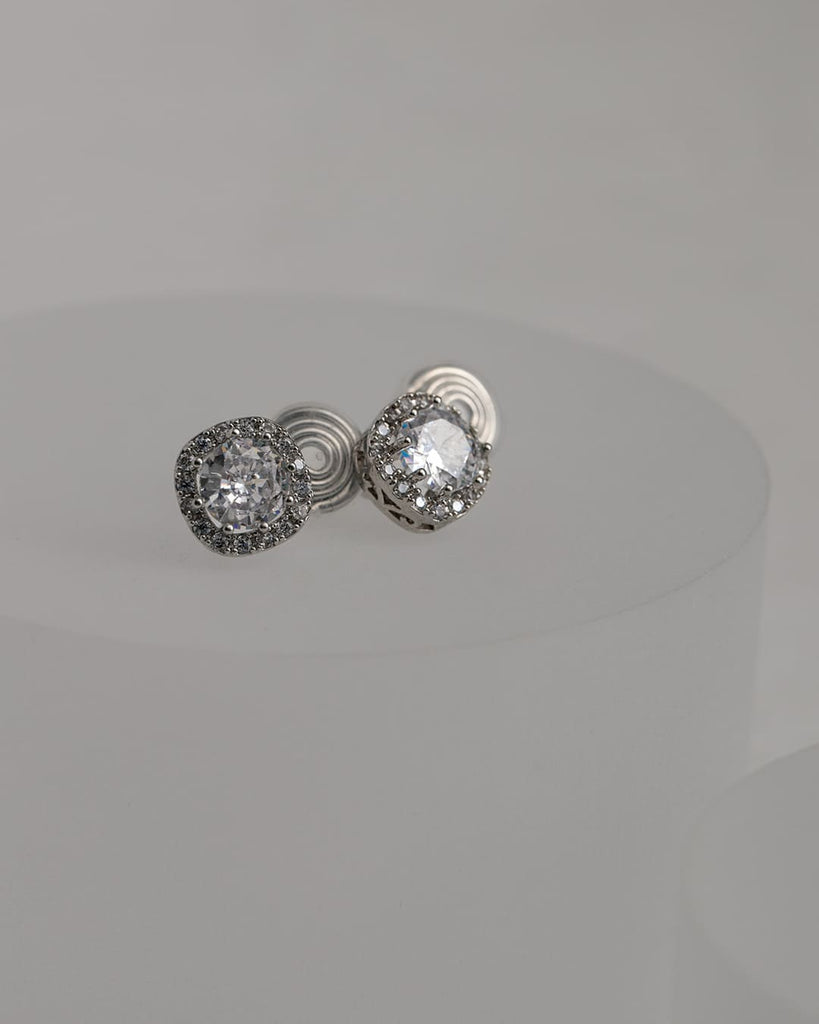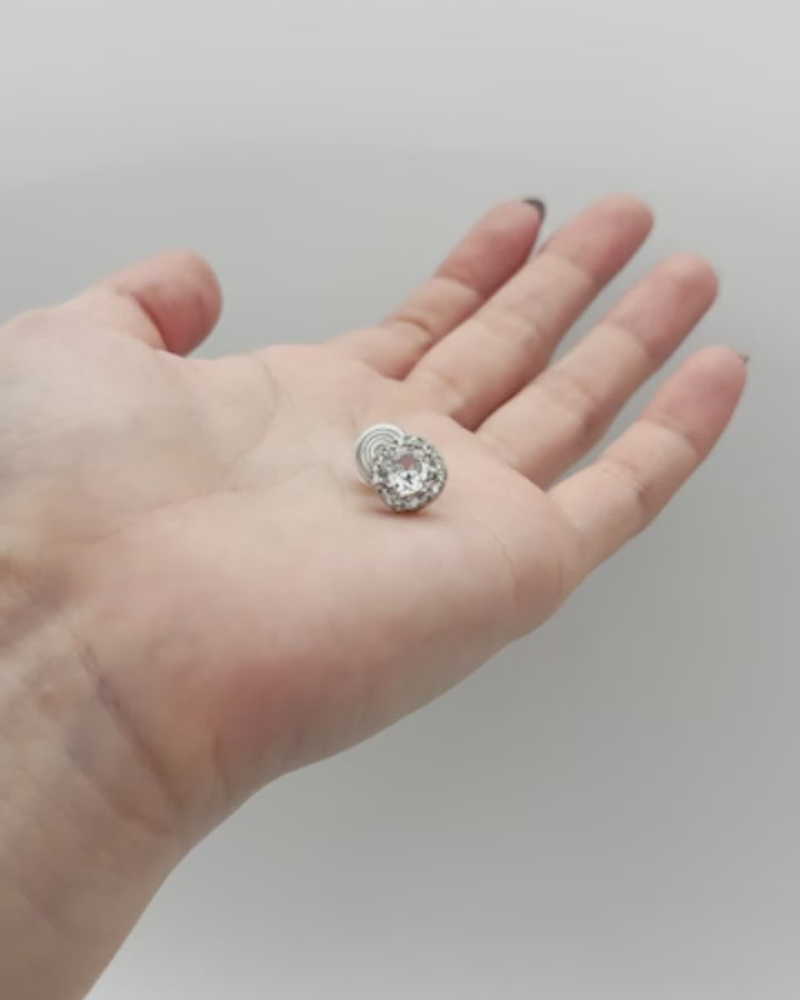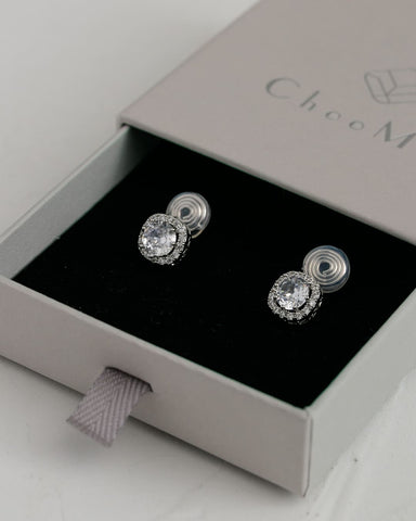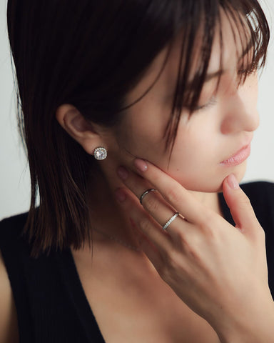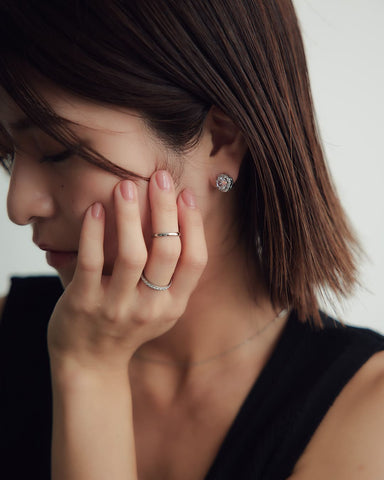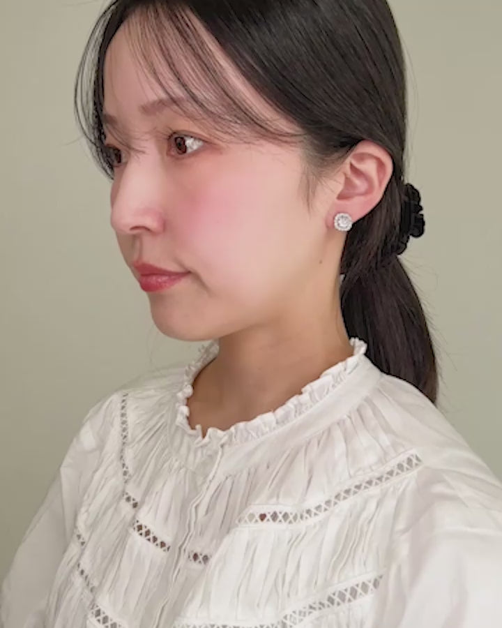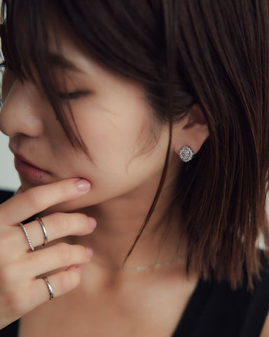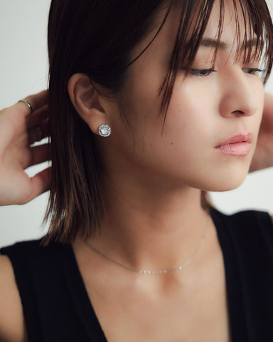中央の大粒キュービックジルコニアをぐるりと囲む繊細なストーンが、光を受けるたびにキラキラと反射し、耳元に上品な華やぎを添えます。