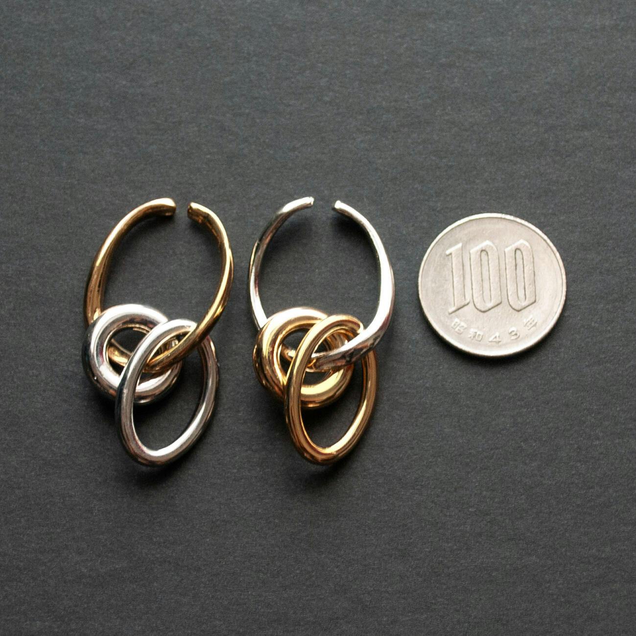 大きさ・形の異なるフープを組み合わせたバイカラーのイヤーカフ。