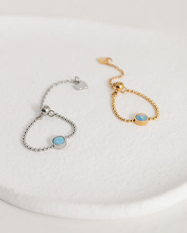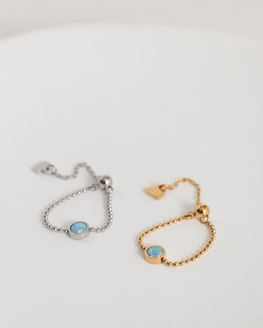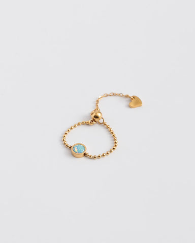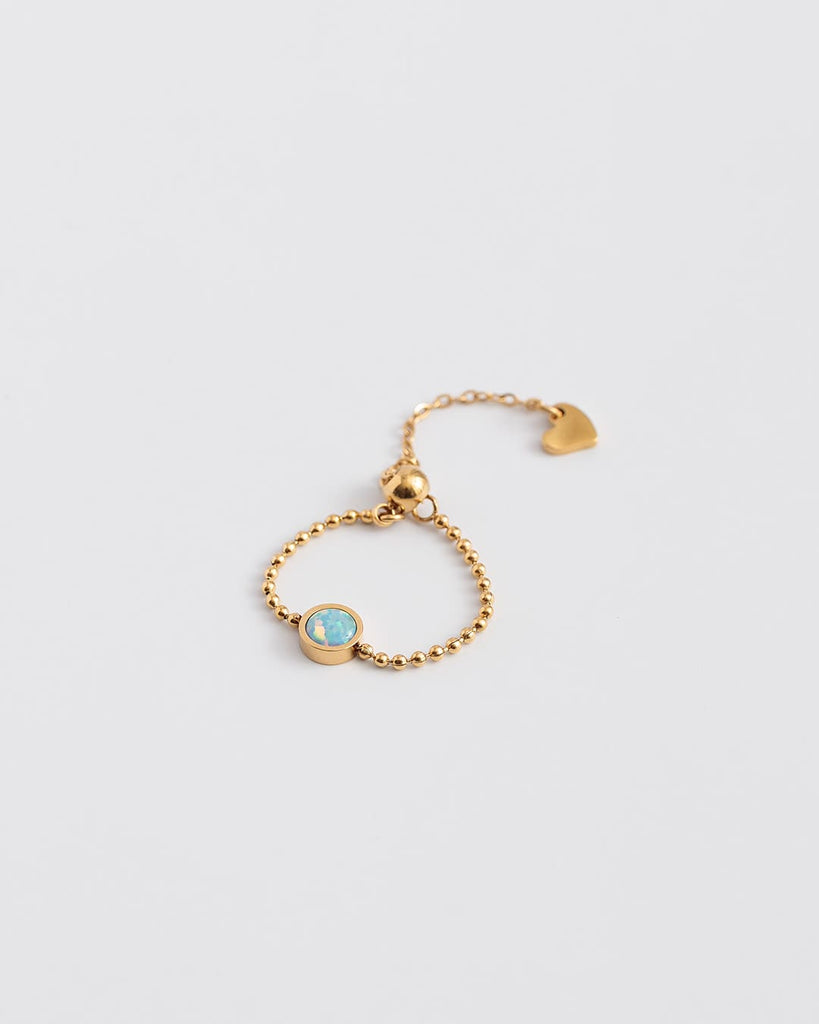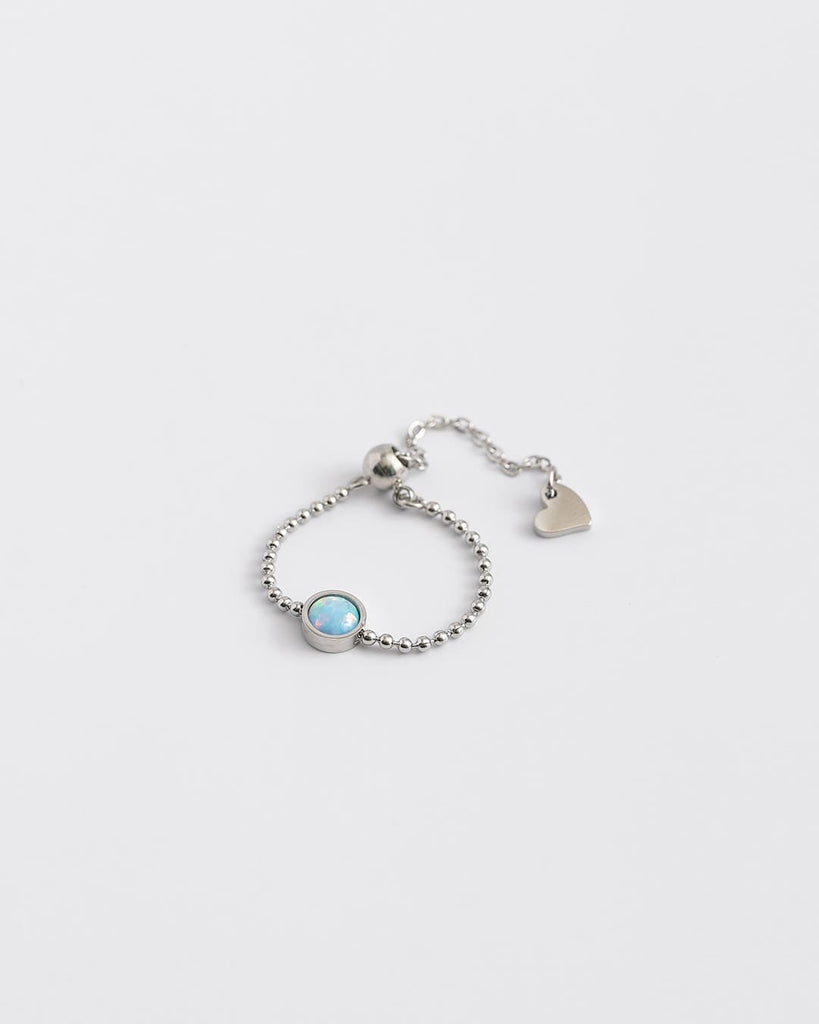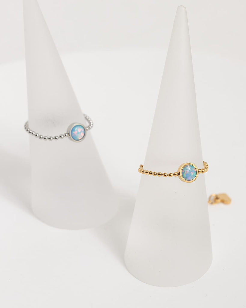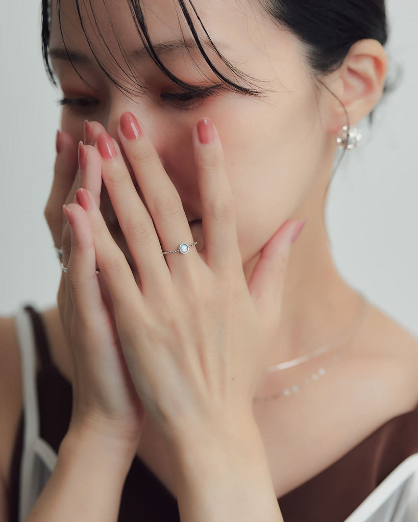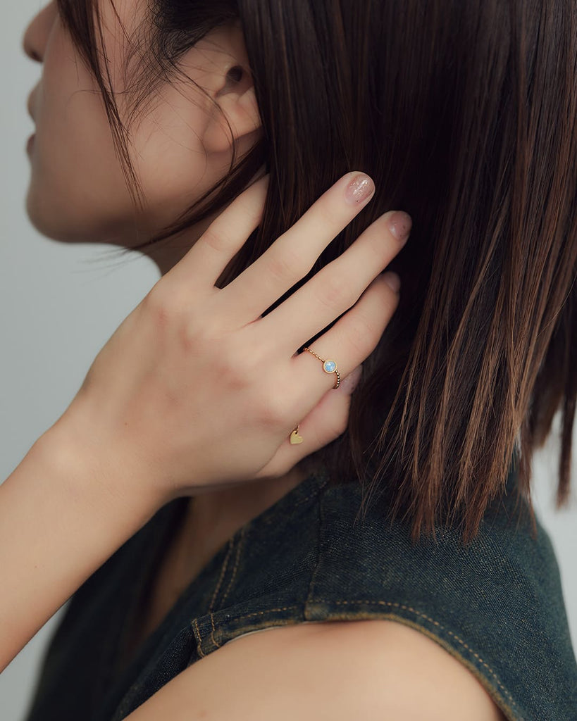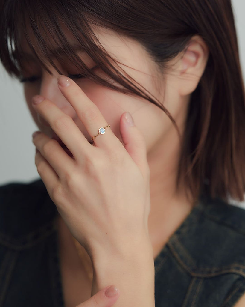 ころんとした小さなオパール風ストーンが、指先でふわっと光をまとったようにきらめくリング。