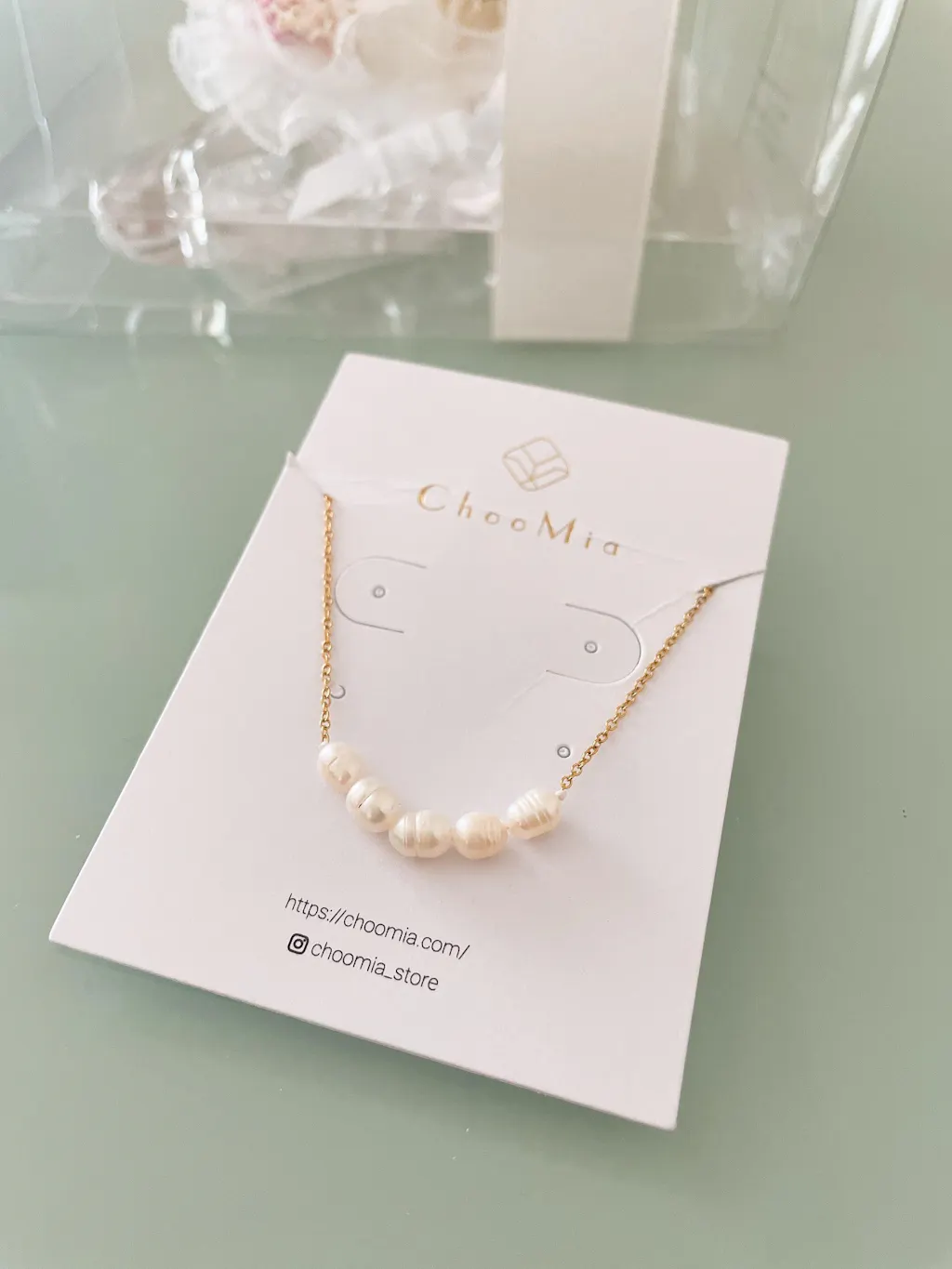 小ぶりながらも、存在感を放つ淡水パールをあしらったネックレス。