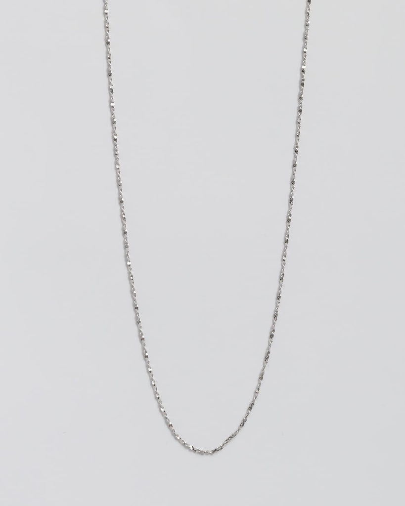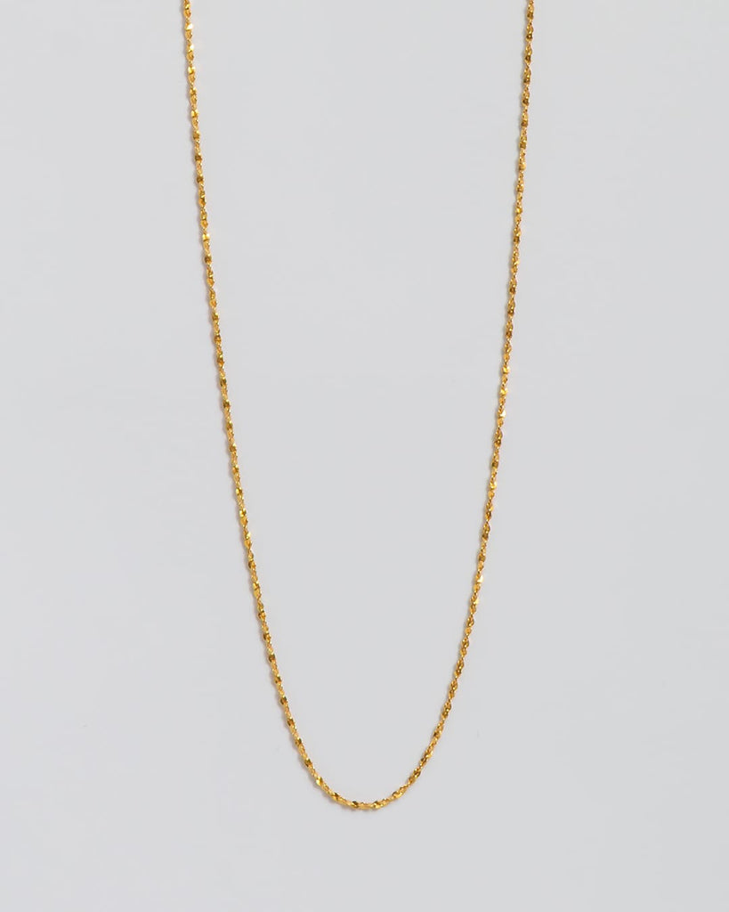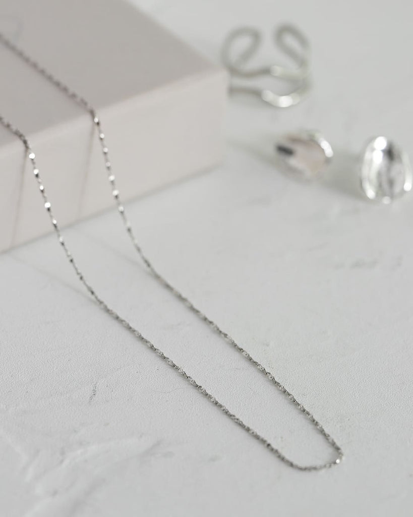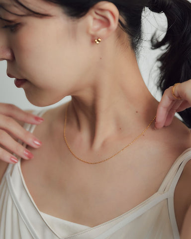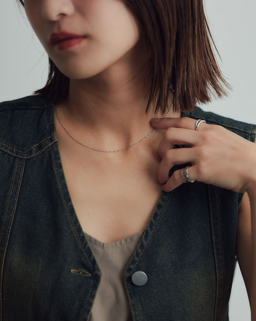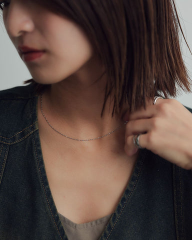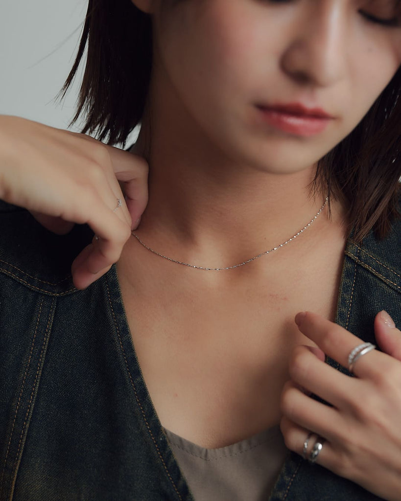 ひねりのあるチェーンが光を細かく拾い、シンプルながらも首元に奥行きを与えてくれます。