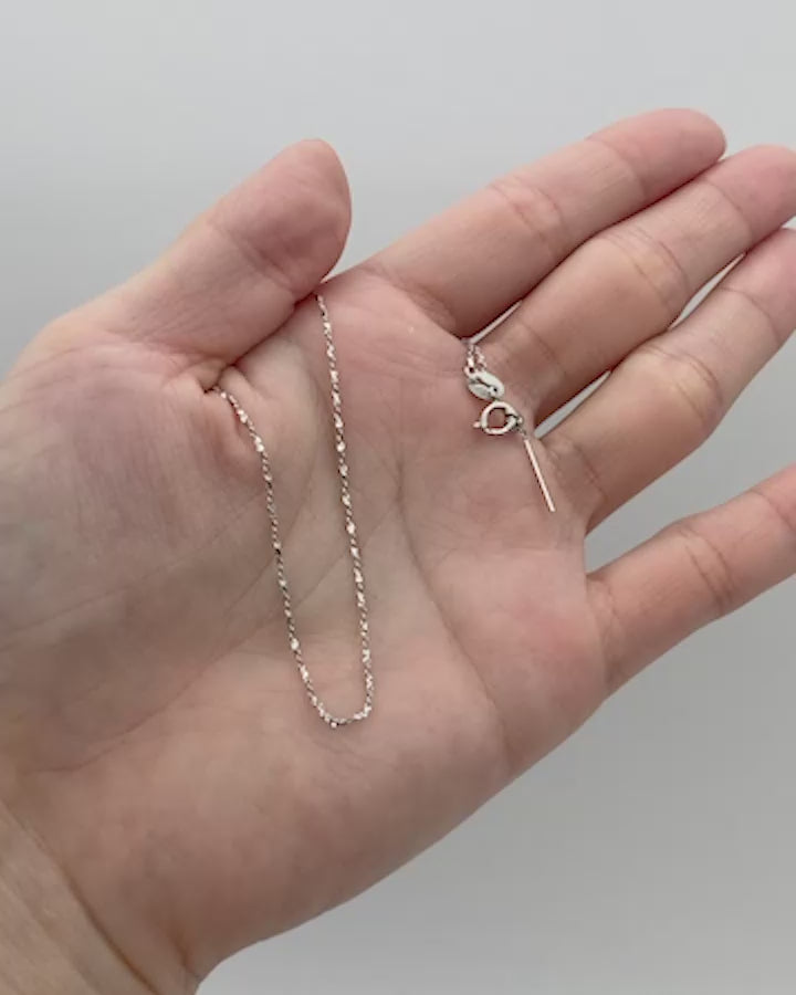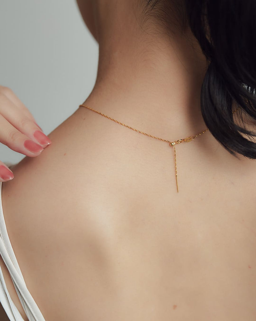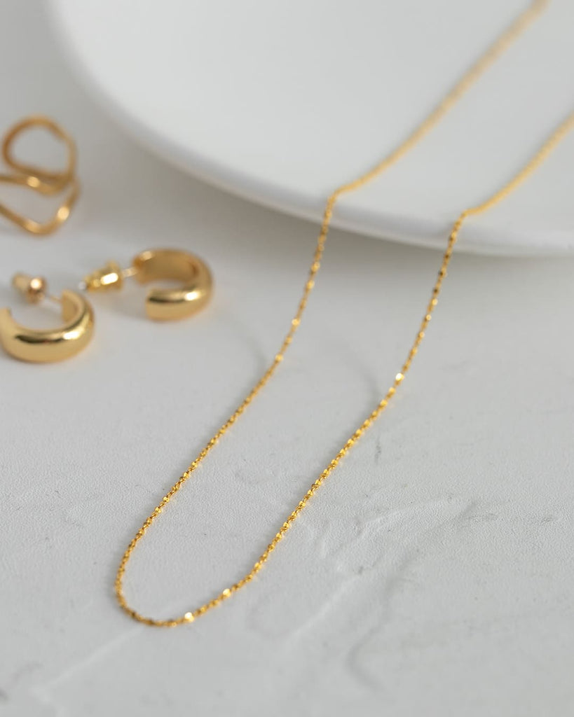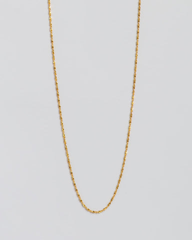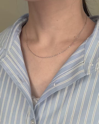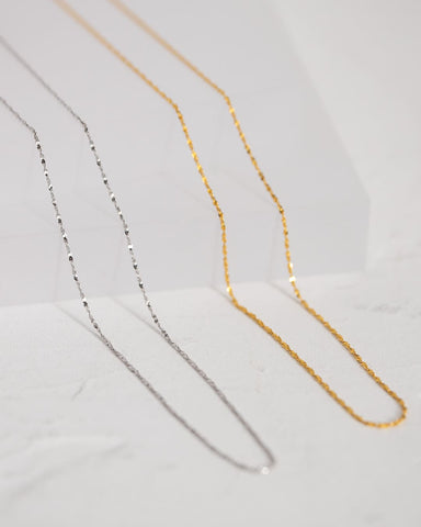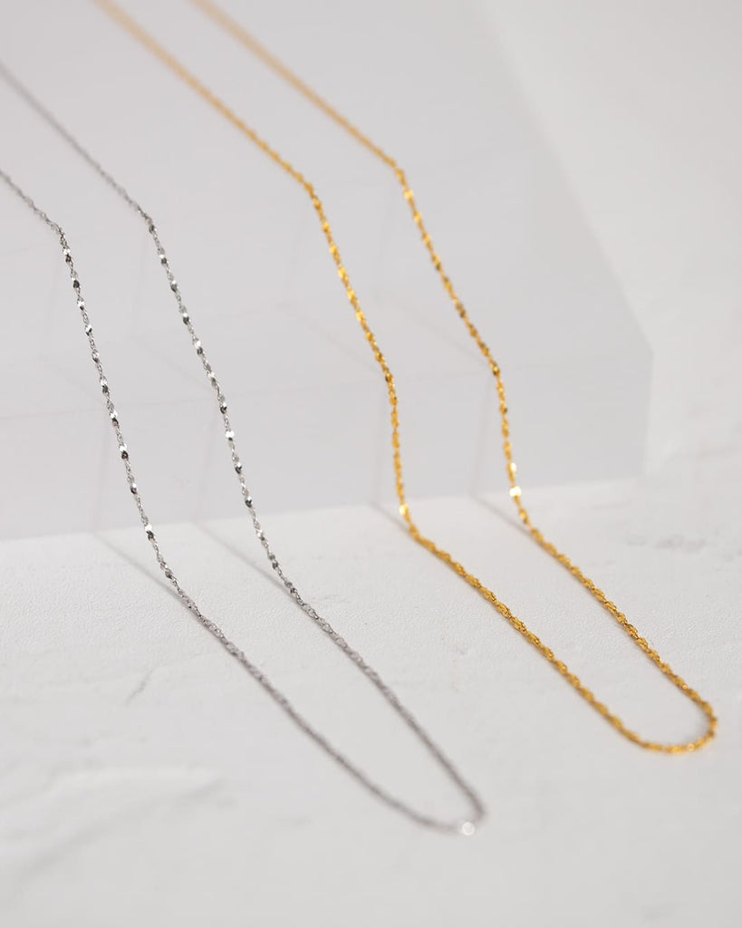 ひねりのあるチェーンが光を細かく拾い、シンプルながらも首元に奥行きを与えてくれます。