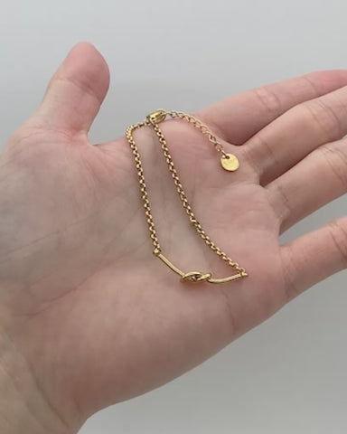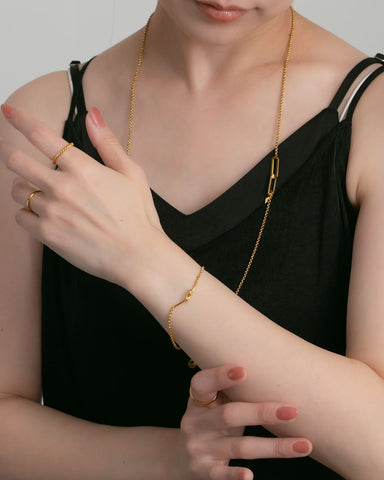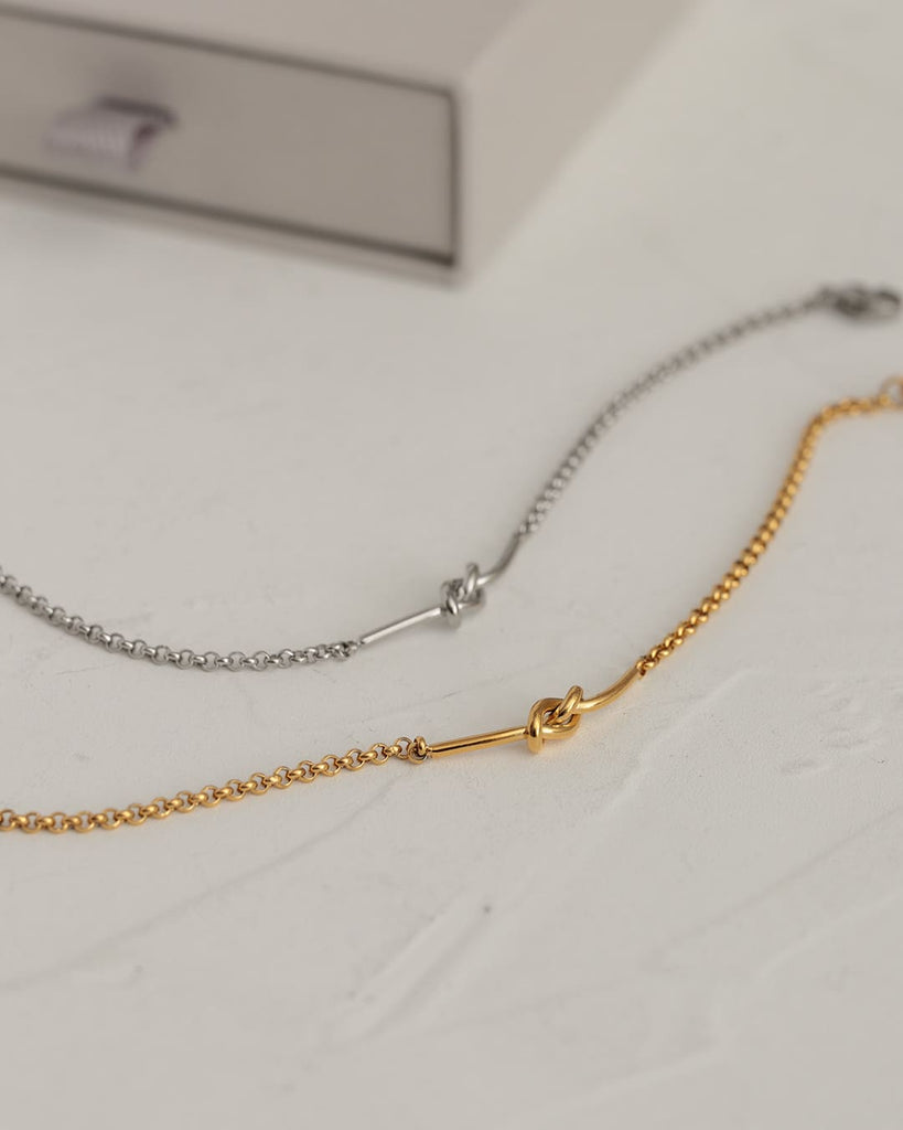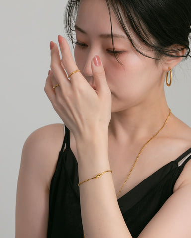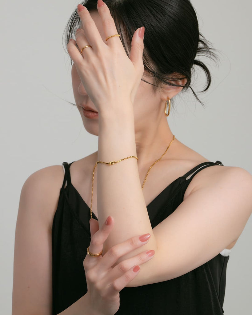 細身のチェーンに小さなノットモチーフをあしらい、きゅっと結ばれたラインがさりげない存在感を放ちます。動くたびにチェーンがすべすべと揺れ、肌に沿ってなじむ軽やかな着け心地。華奢ながらも、ただシンプルなだけでは終わらない表情が魅力です。