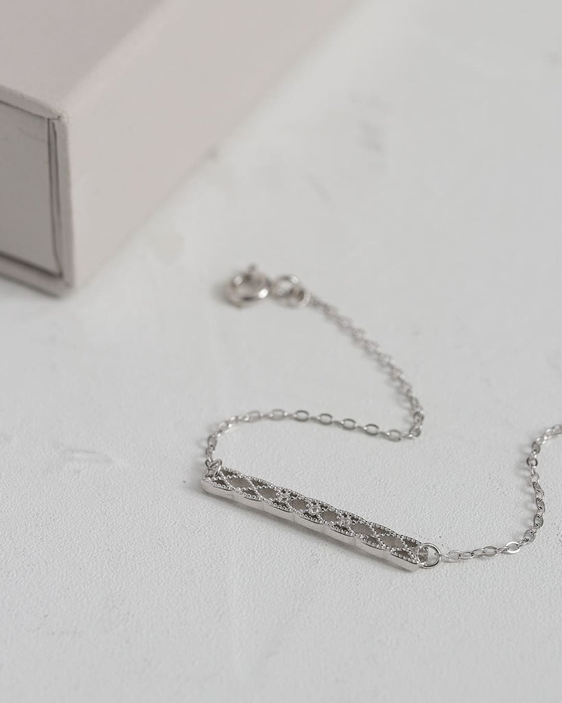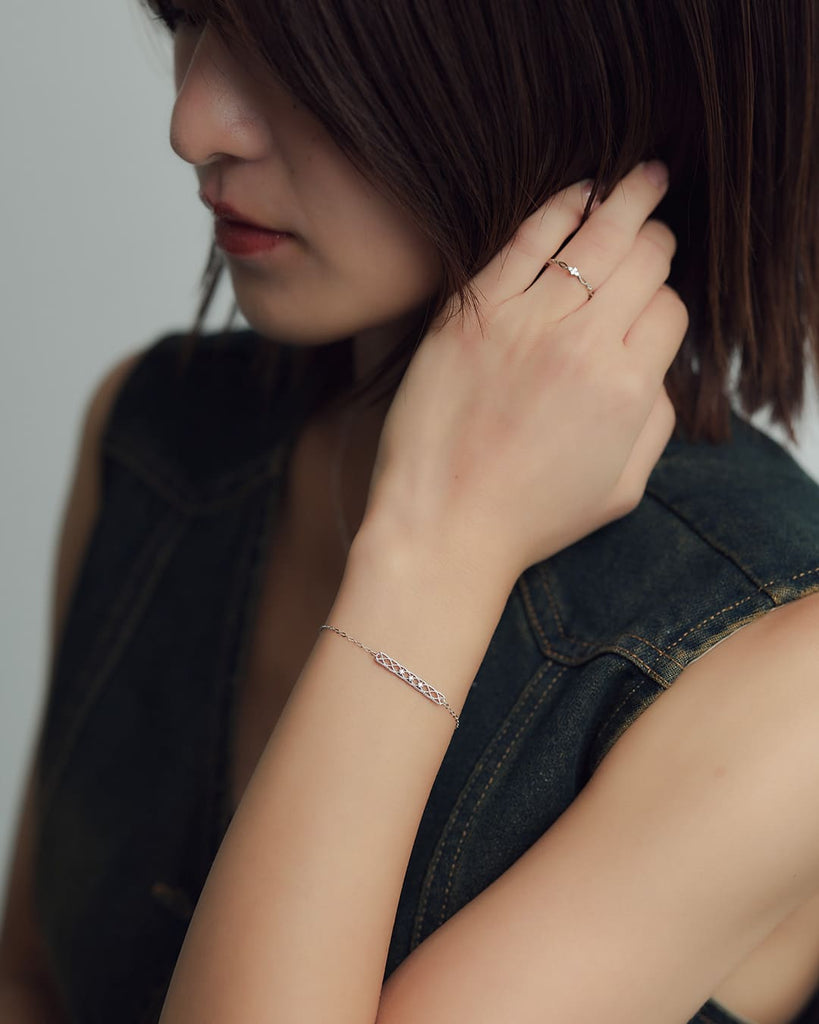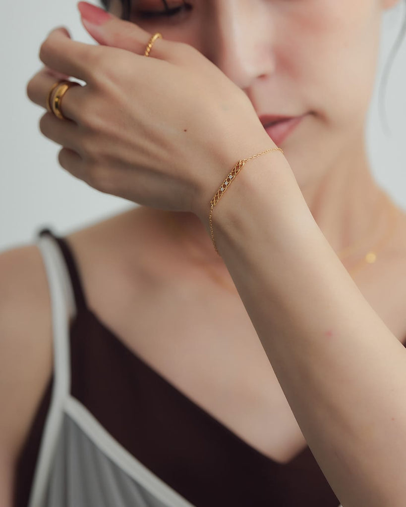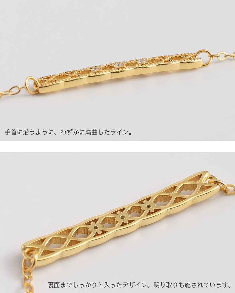 細やかな透かし模様のバーには、小粒のジルコニアがちりちりときらめき、手元にそっと光を添えてくれます。