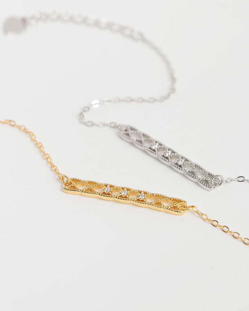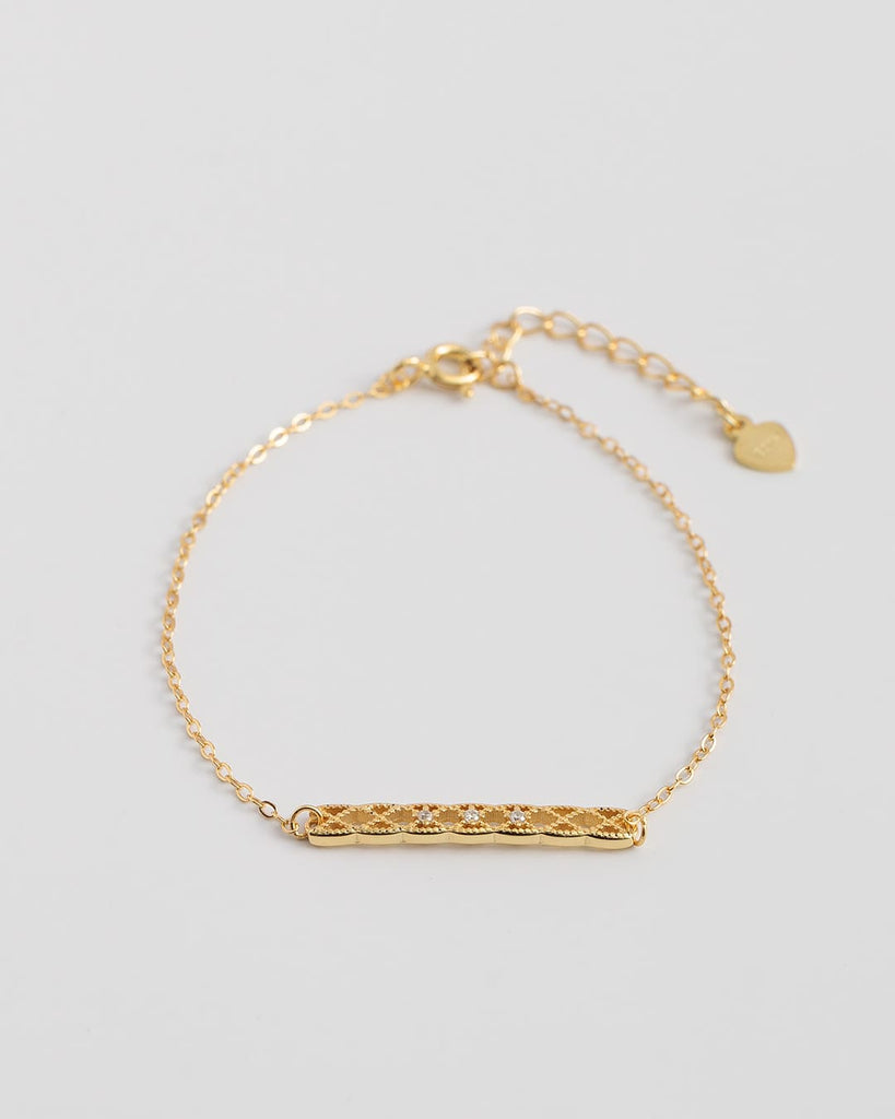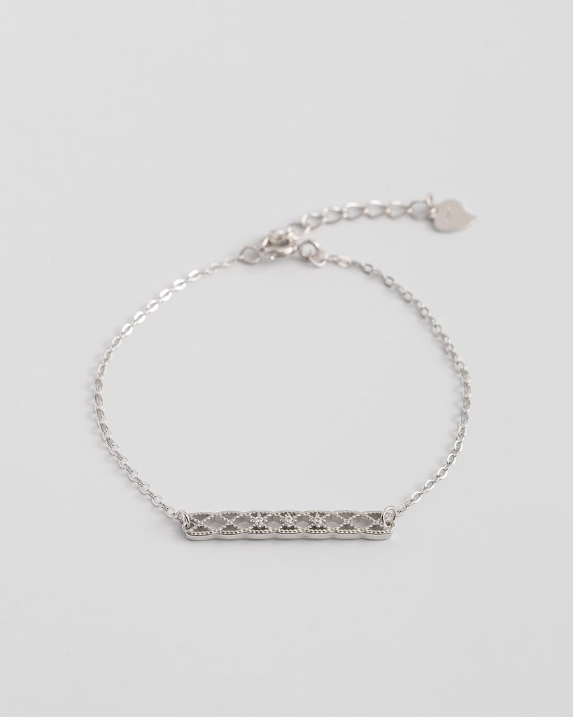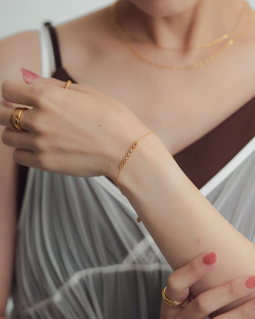 細やかな透かし模様のバーには、小粒のジルコニアがちりちりときらめき、手元にそっと光を添えてくれます。