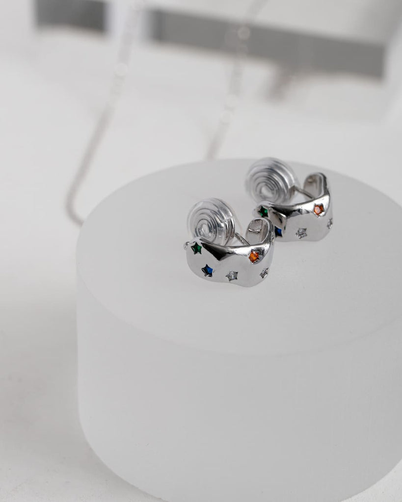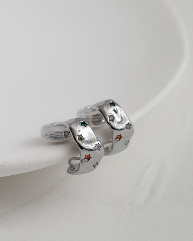 凹凸のあるメタルプレートに、カラフルな星モチーフを散りばめたイヤリング。