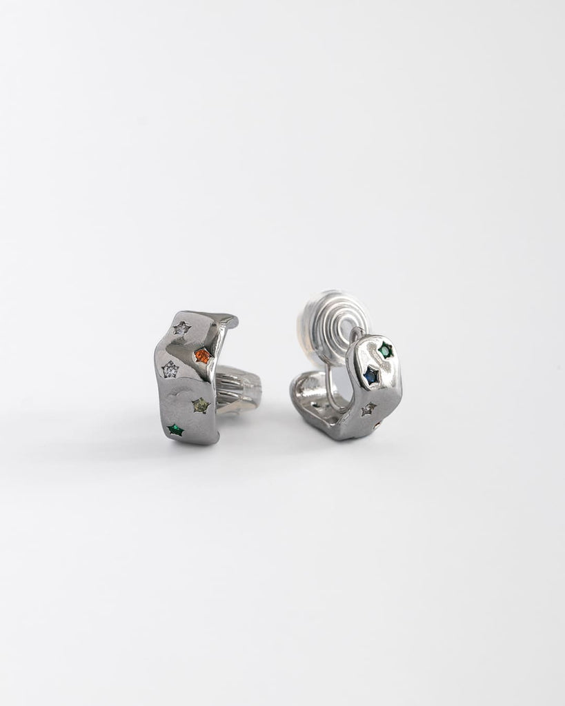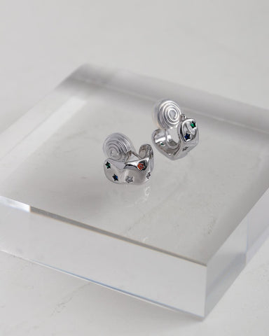 つるんとしたロジウムの艶の中に、グリーンやオレンジ、ブルーのストーンがきらりと瞬き、まるで夜空のかけらを閉じ込めたようなデザインです。