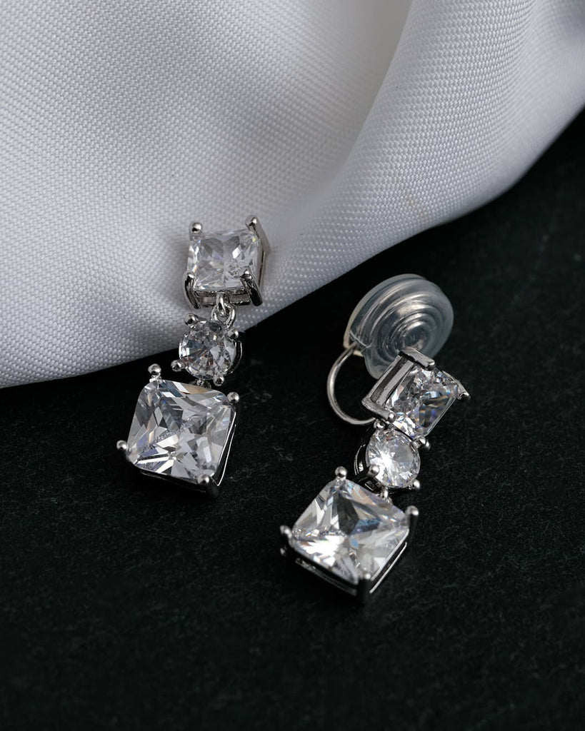 上からスクエア、ラウンド、そしてひときわ目を惹く大粒スクエアが揺れ、動くたびにきらきらと多彩な光を放ちます。