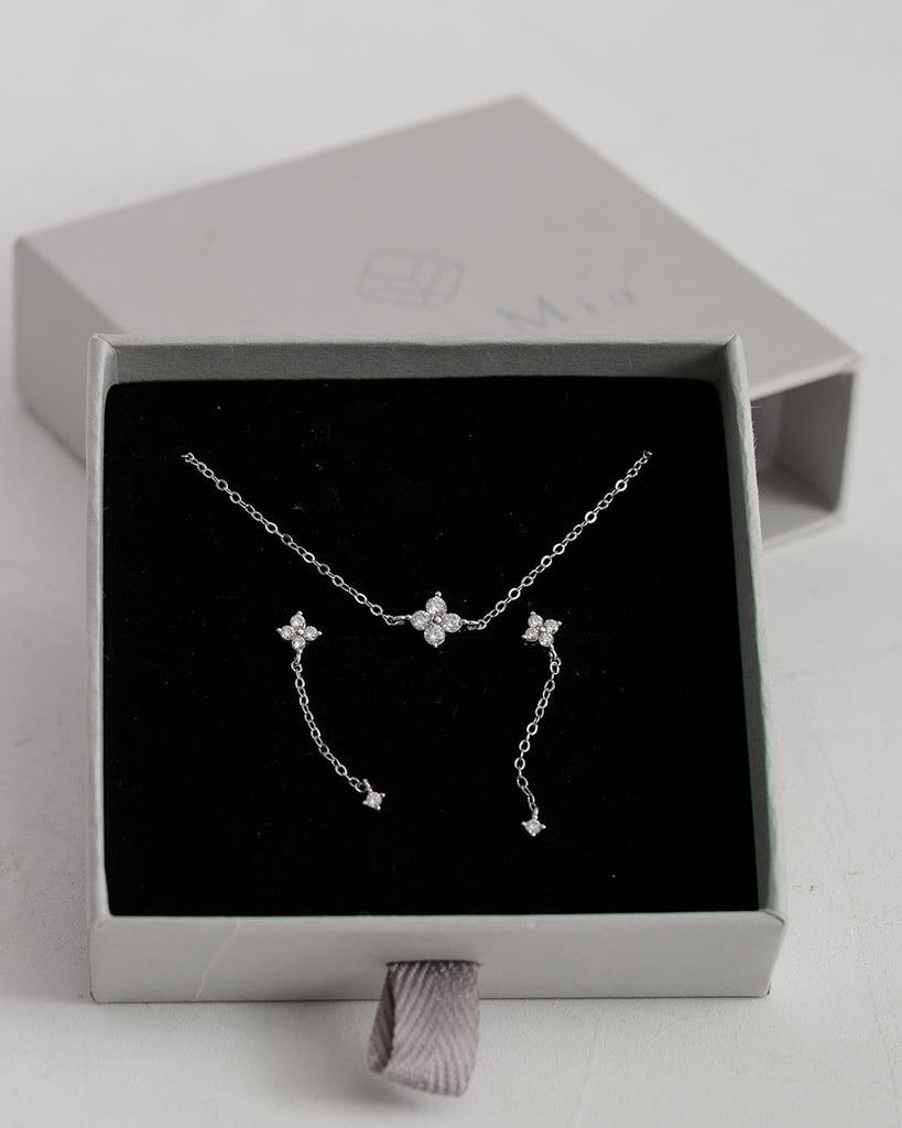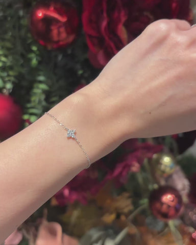 冬の寒空に雪の華がふわりと舞うような、きらっと輝くお花モチーフのブレスレットとピアスのセットです。