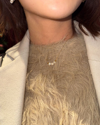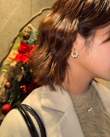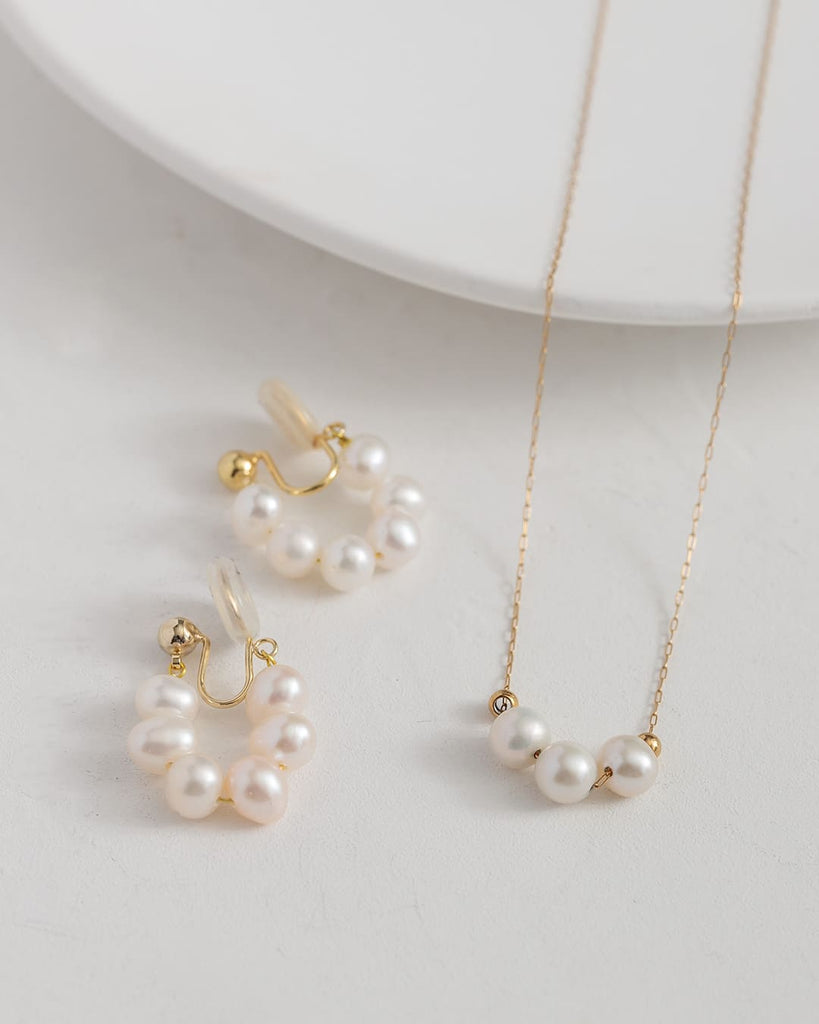 並んだパールのデザインがまるで冬の花束のようなセット。甘さを抑えた上品なパールアイテムをセレクトしました。光を優しく反射し、顔まわりを明るく見せてくれる、控えめな華やかさが魅力です。