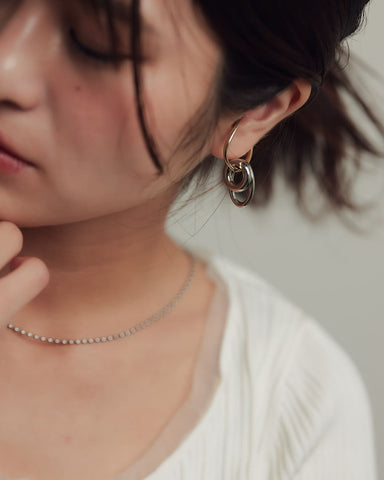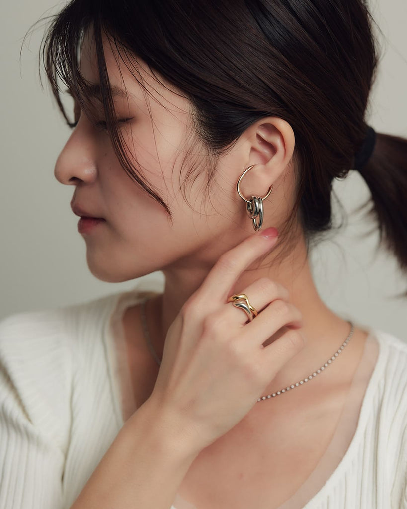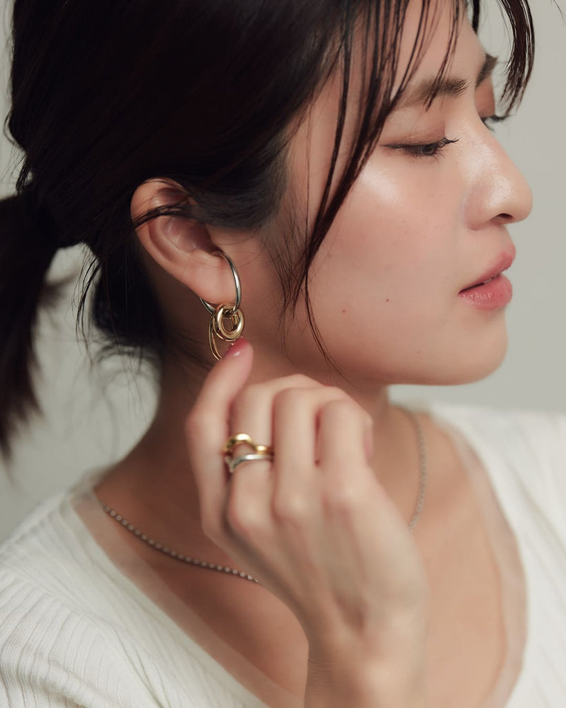 大きさ・形の異なるフープを組み合わせたバイカラーのイヤーカフ。