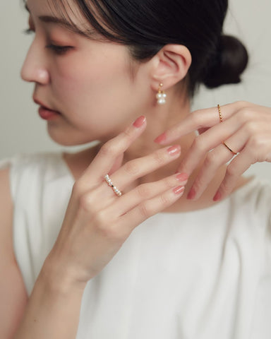 小粒なパールの上品さと華奢さで、女性らしい雰囲気が手に入るアイテム。