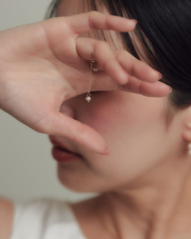 ゆらゆらと揺れるチェーンの先にもパールがあしらわれています。