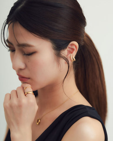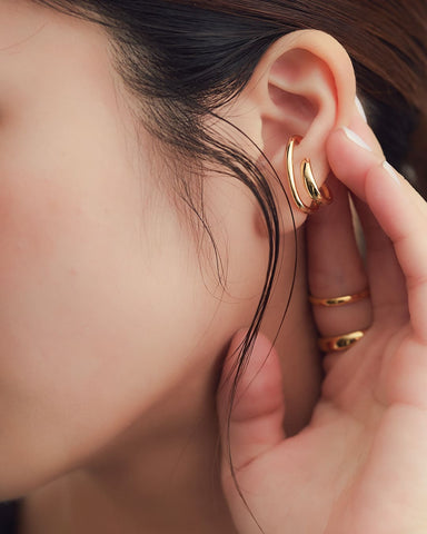 装着はシンプルに、耳の縁に引っかけるだけ。ピアスホールがなくても、モードなスタイルが簡単に完成。