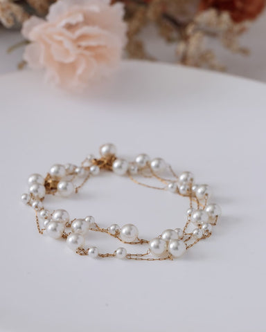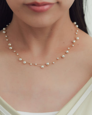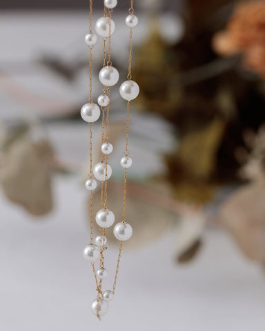 大小のパールが織りなすリズムは、淡いベール越しに覗く光の粒のように繊細。