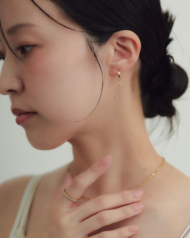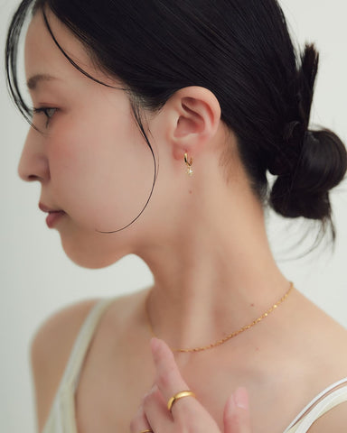 耳元でちょんっときらめくチャームがアクセントになり、さりげなく華やぎを添えてくれます。