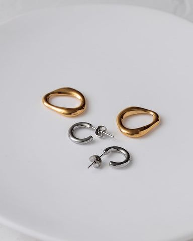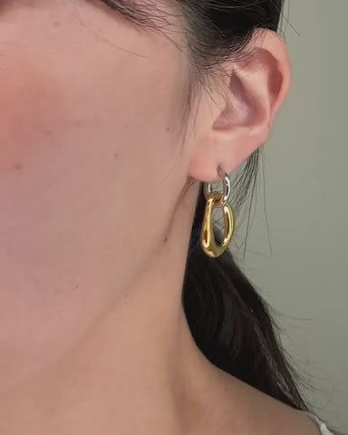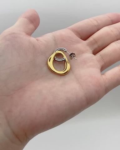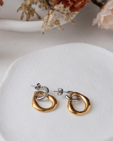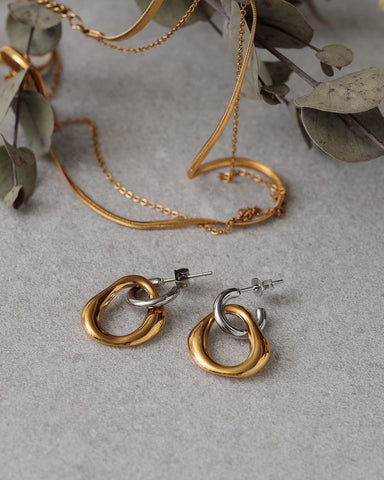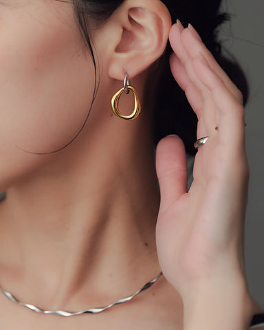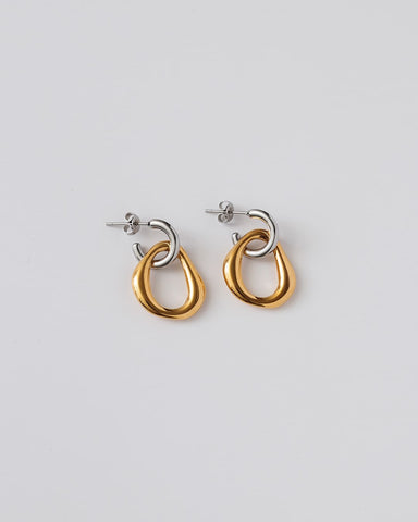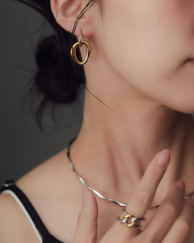 ゴールドとシルバー、異なる2色のフープが重なり合うモダンなピアス。