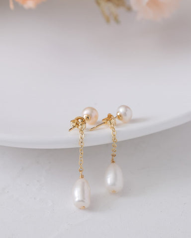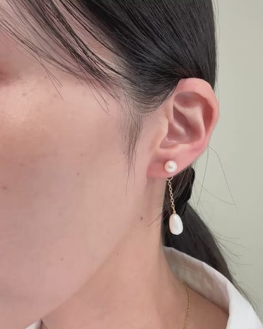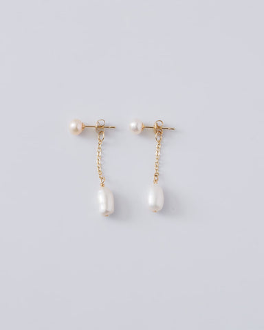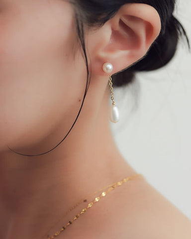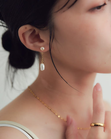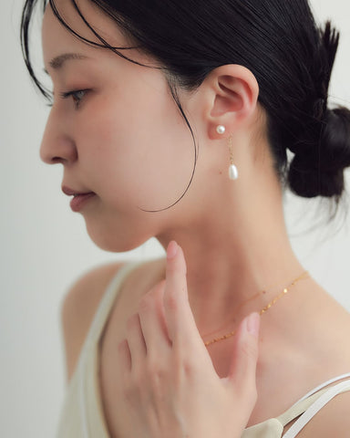 耳たぶにちょこんと添えられた小粒パールから、きらりと揺れるチェーン。