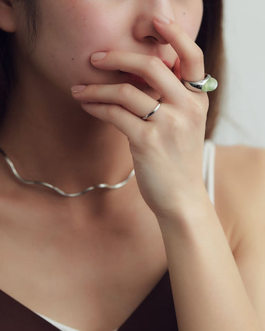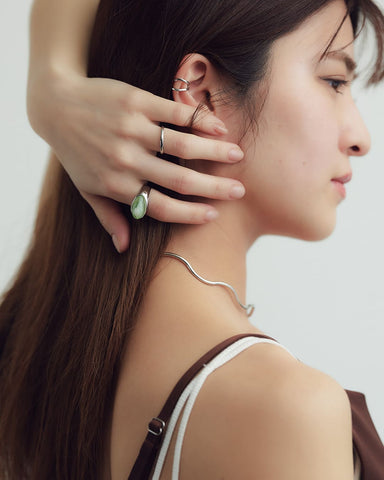 - Silver925・Silver950などの貴金属はやわらかく繊細な素材です。強い力や長時間の負担がかかると、変形や石取れの原因となることがございますので、お取り扱いにはご注意ください。