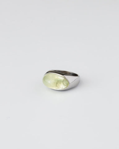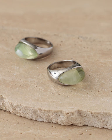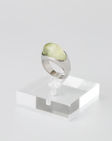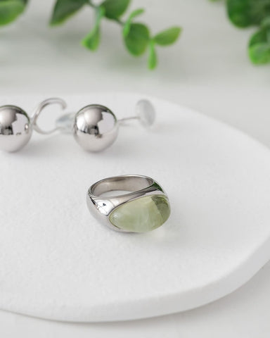 ころんとした厚みが可愛らしさを添えつつ、艶やかなシルバーカラーの台座が全体をクールに引き締めてくれるのがポイント。