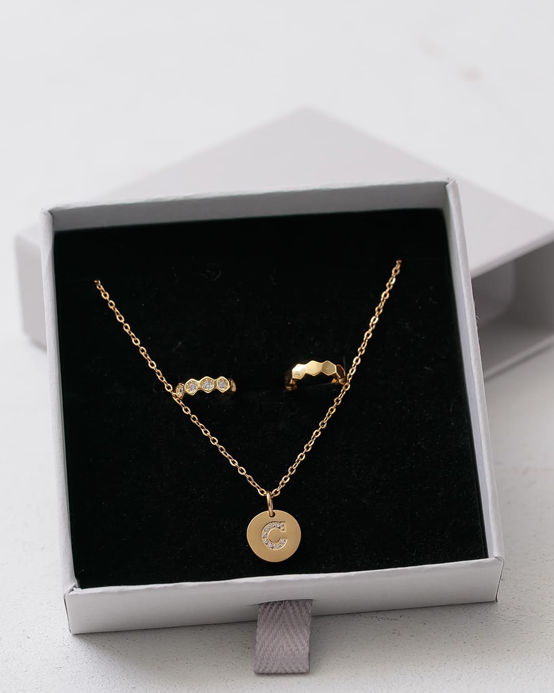 【S925/14K】ハニーコンボデザイン×ジルコニアイヤーカフと【14K】イニシャルサークルステンレスネックレスの組み合わせ。