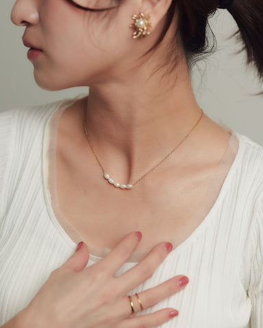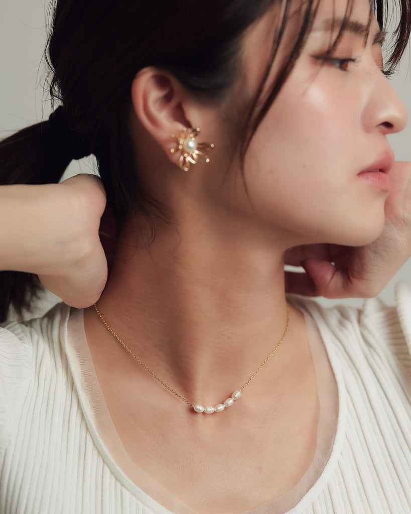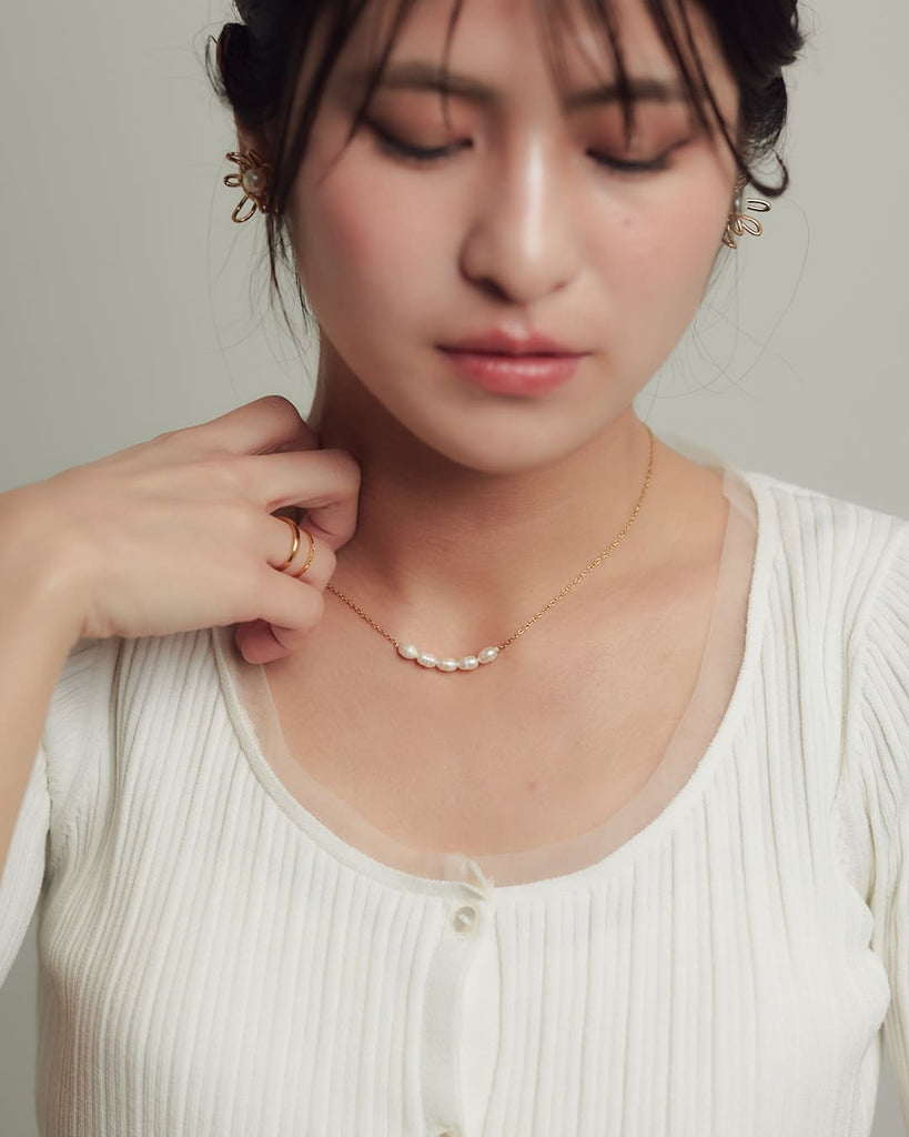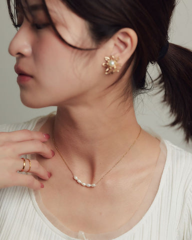 小ぶりながらも、存在感を放つ淡水パールをあしらったネックレス。