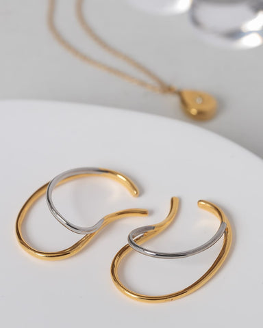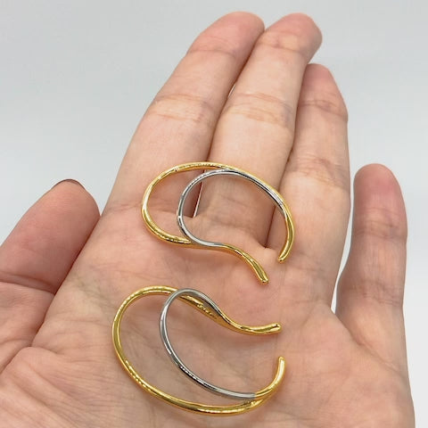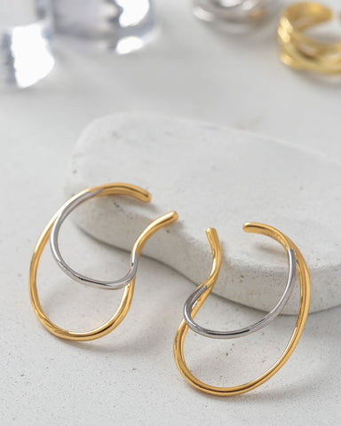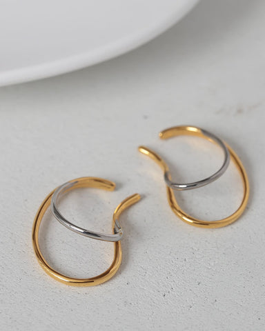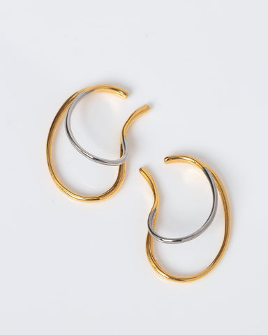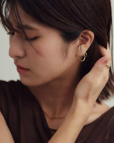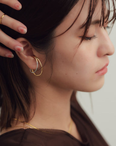 レイヤードしたようなデザインがひとつ取り入れるだけで洗練された印象に仕上がる、ゴールド×シルバーのコンビカラーイヤーカフ。