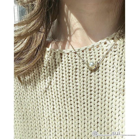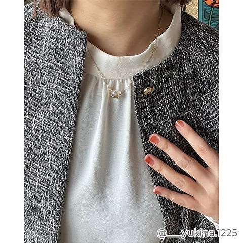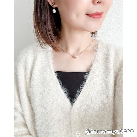 8mmのイミテーションパールが、しっとりとした輝きを放ち、胸元でキラリと光を集めます。