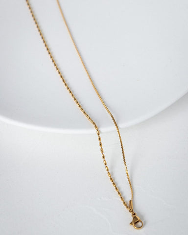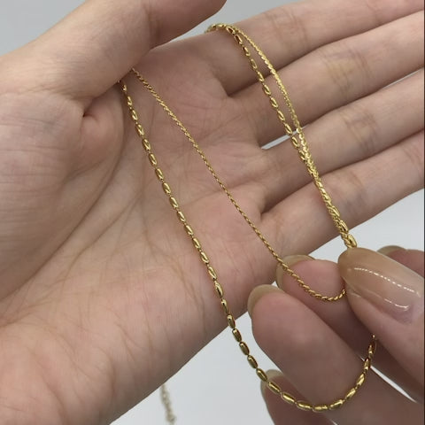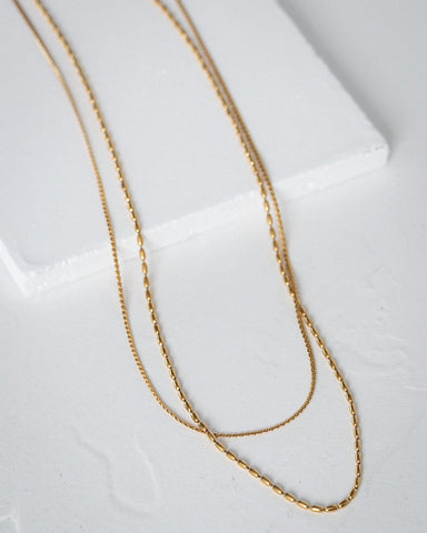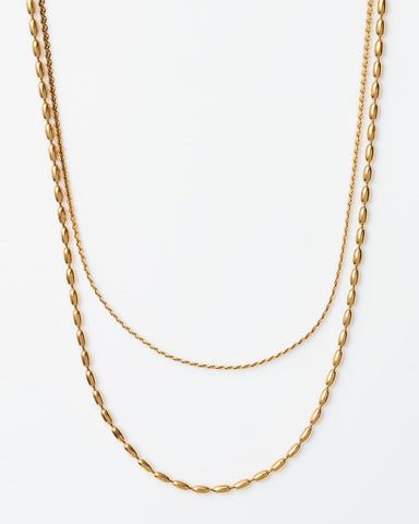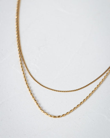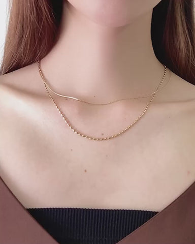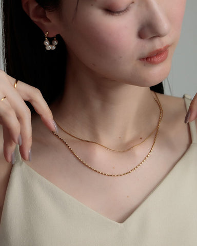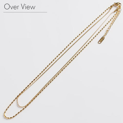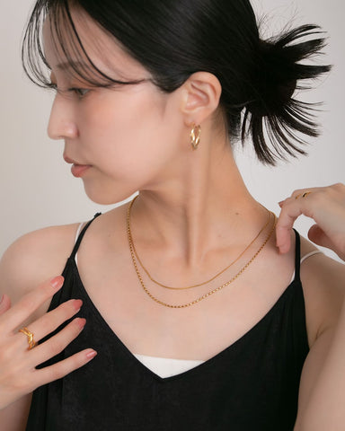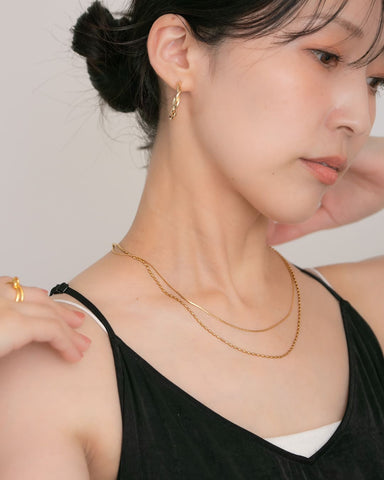 シリンダーチェーンと平らなロープ状チェーンを使用し、2連に見える上品なシルエットで、胸元に自然な立体感をプラスしてくれるネックレス。