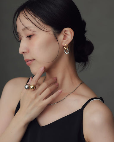 リンクの重なりが描くラインは、まるで流れるリズムのよう。いつもの装いにリズムと輝きをプラスしてくれる、頼れる一点です。