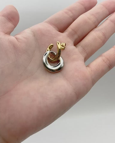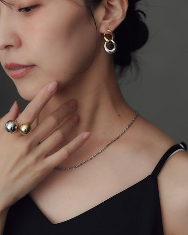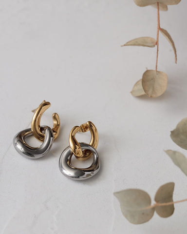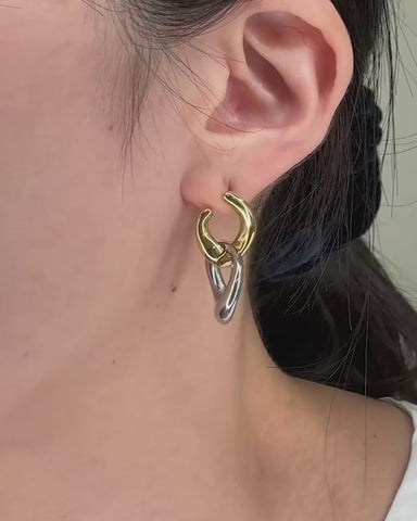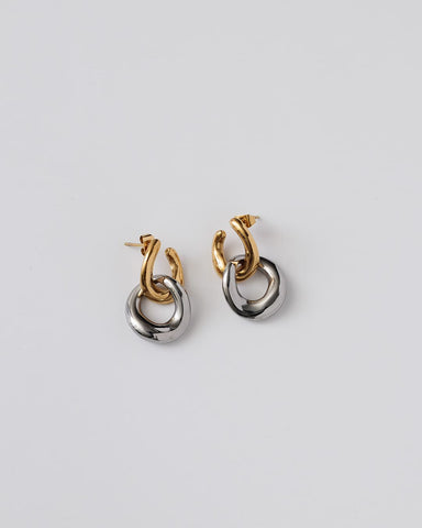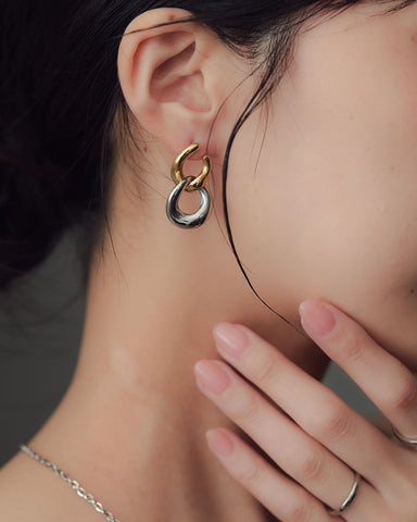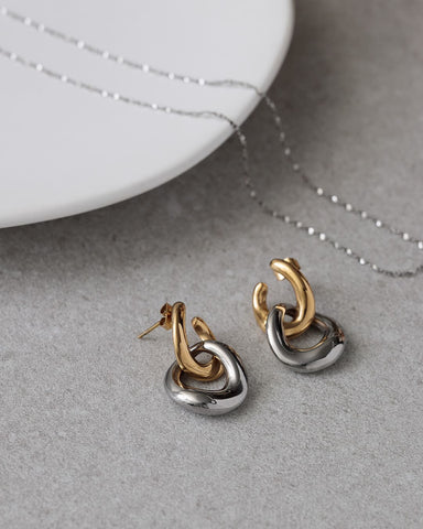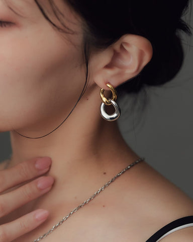 ゴールドとシルバー、2色のリンクモチーフが交差するように重なり、耳元で存在感を放つピアス。