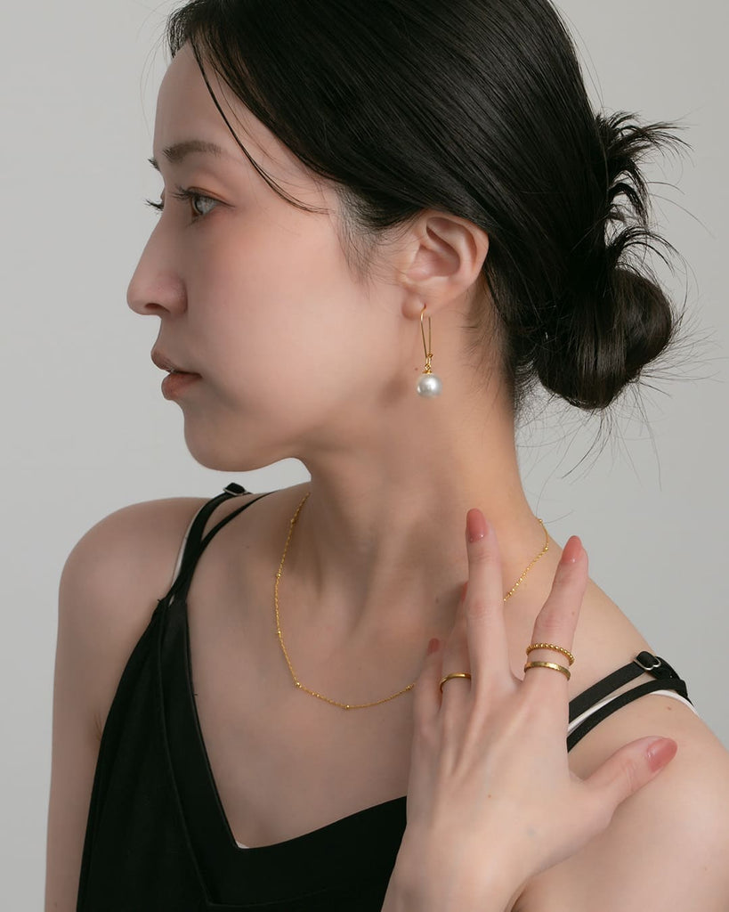 ぷっくりとしたガラスパールが光をやさしくまとい、動くたびにキラリと反射して、シンプルな装いにも華を添えてくれます。