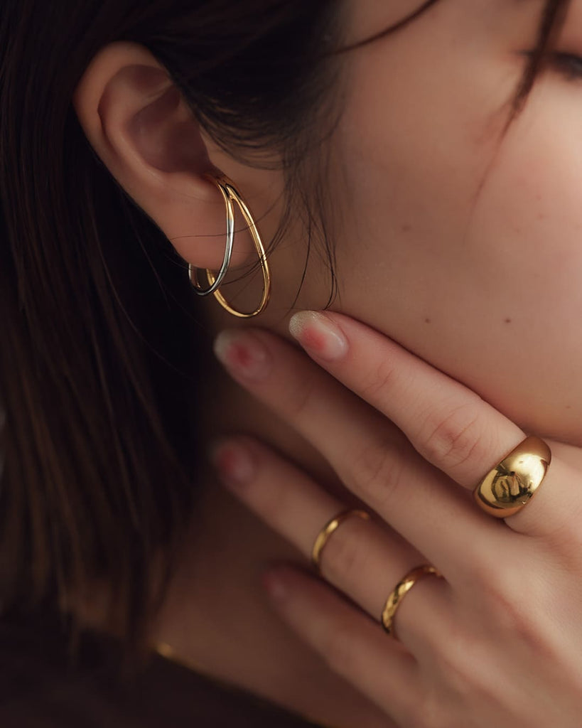 レイヤードしたようなデザインがひとつ取り入れるだけで洗練された印象に仕上がる、ゴールド×シルバーのコンビカラーイヤーカフ。