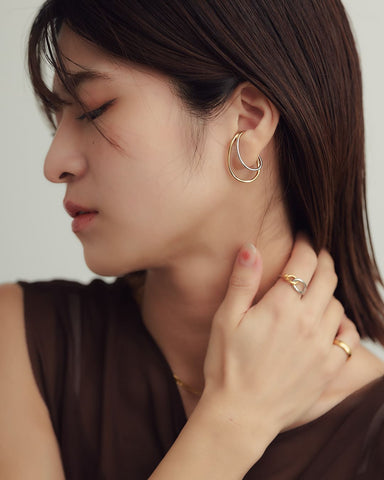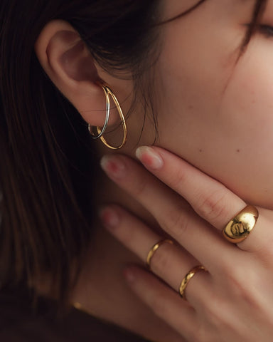 コーディネートや肌色を選ばずに使える万能カラーは、ゴールド派・シルバー派のどちらにもおすすめ。シンプルなトップスに合わせるだけで、こなれ感のある耳元を演出してくれます。
