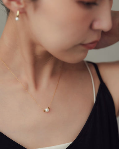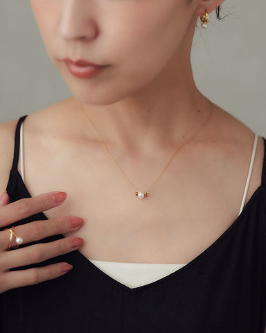 シンプルながらも上品な輝きを放つパールがデコルテにそっと寄り添い、自然な女性らしさを引き立てます。