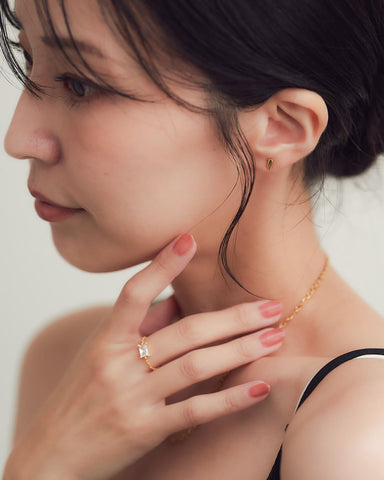 すっとした直線的なフォルムが洗練された印象を与え、耳元にさりげない輝きをプラス。