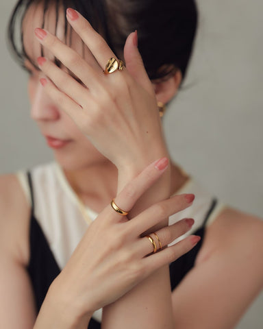 指を包み込み、ハグするようなデザインとなめらかな着け心地が魅力のワイドリング。