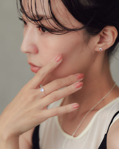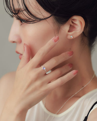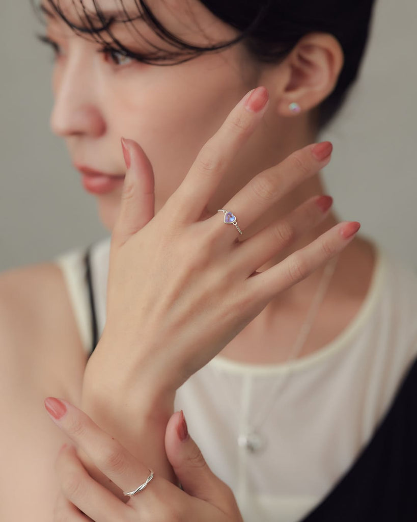 中央には高さのあるストーンをセット。角度によってかすかに浮かぶ“シラー風”の輝きが、まるで月の光を閉じ込めたような神秘的な美しさを演出します。