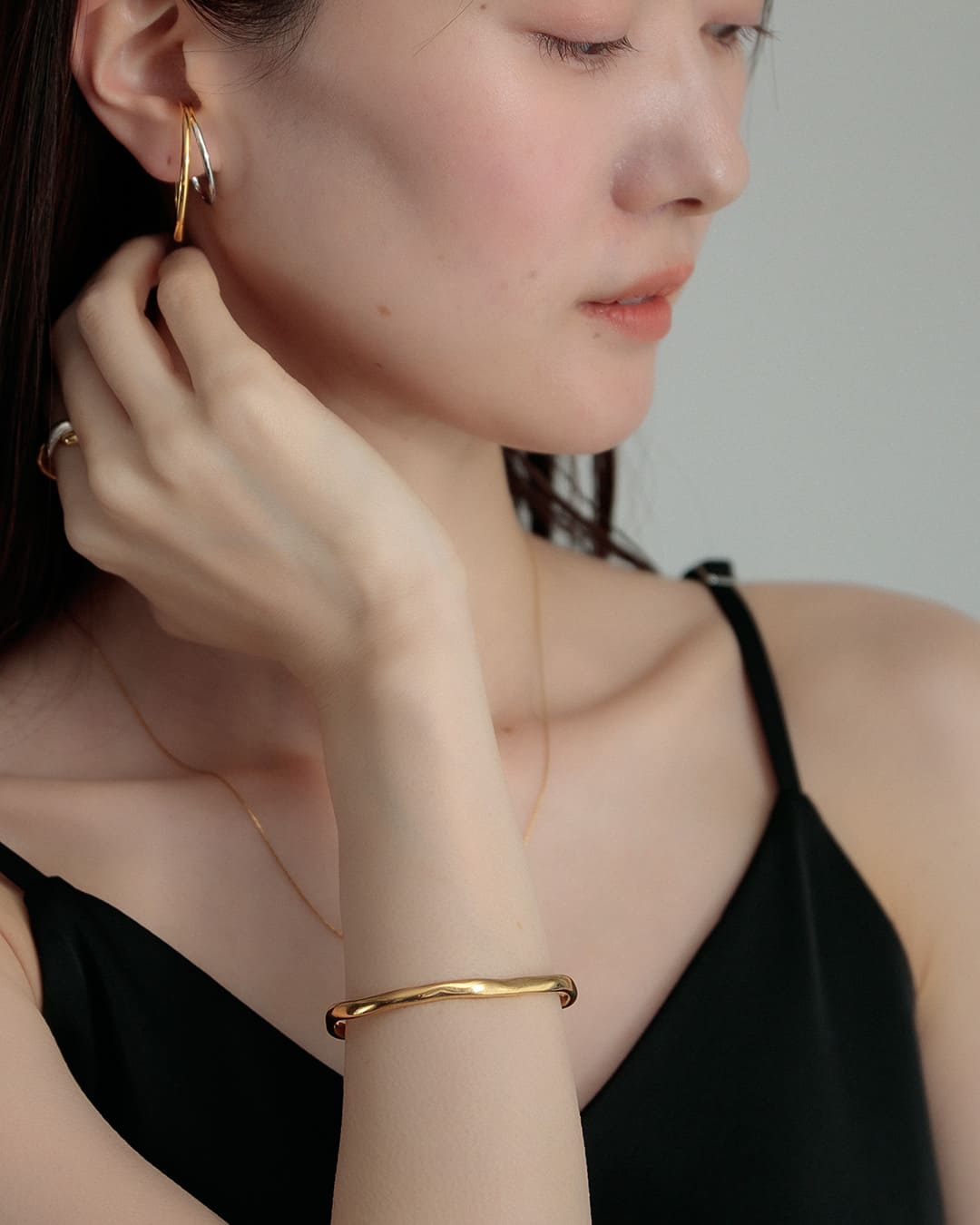 手元にさりげないニュアンスを添える、シンプルながらも洗練されたバングル。程よいゆらぎのあるラインが、光を受けてキラッと輝き、手元を美しく見せてくれます。シンプルなデザインなので、カジュアルからフォーマルまで幅広いコーデにマッチ。さらりとつけるだけで、大人のこなれ感を演出します。