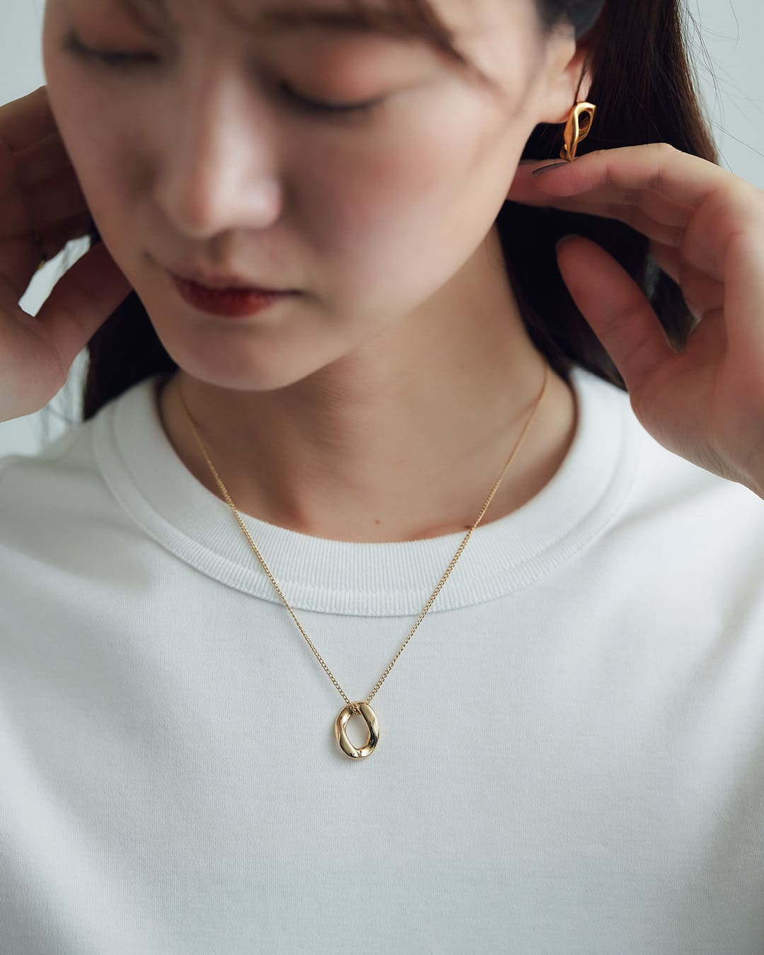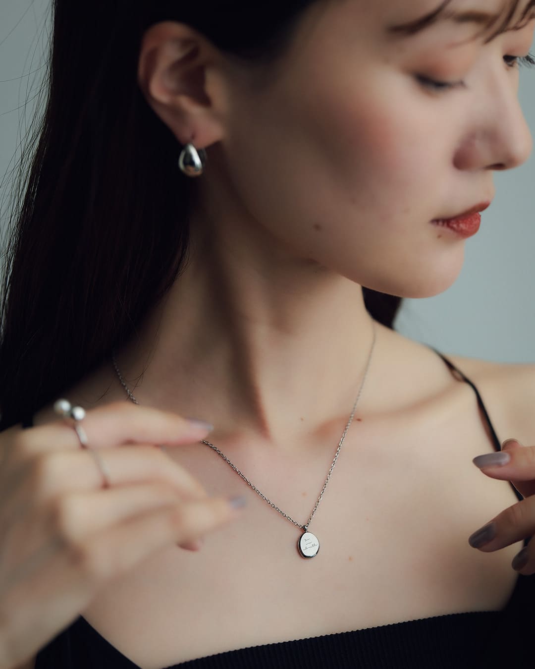 シンプルなプレートデザインのネックレス。ただのラウンドではなく、あえて歪みを加えた有機的フォルムがナチュラルな抜け感を演出。丁寧な面取り加工で、光を受けて液体のように艶めきます。