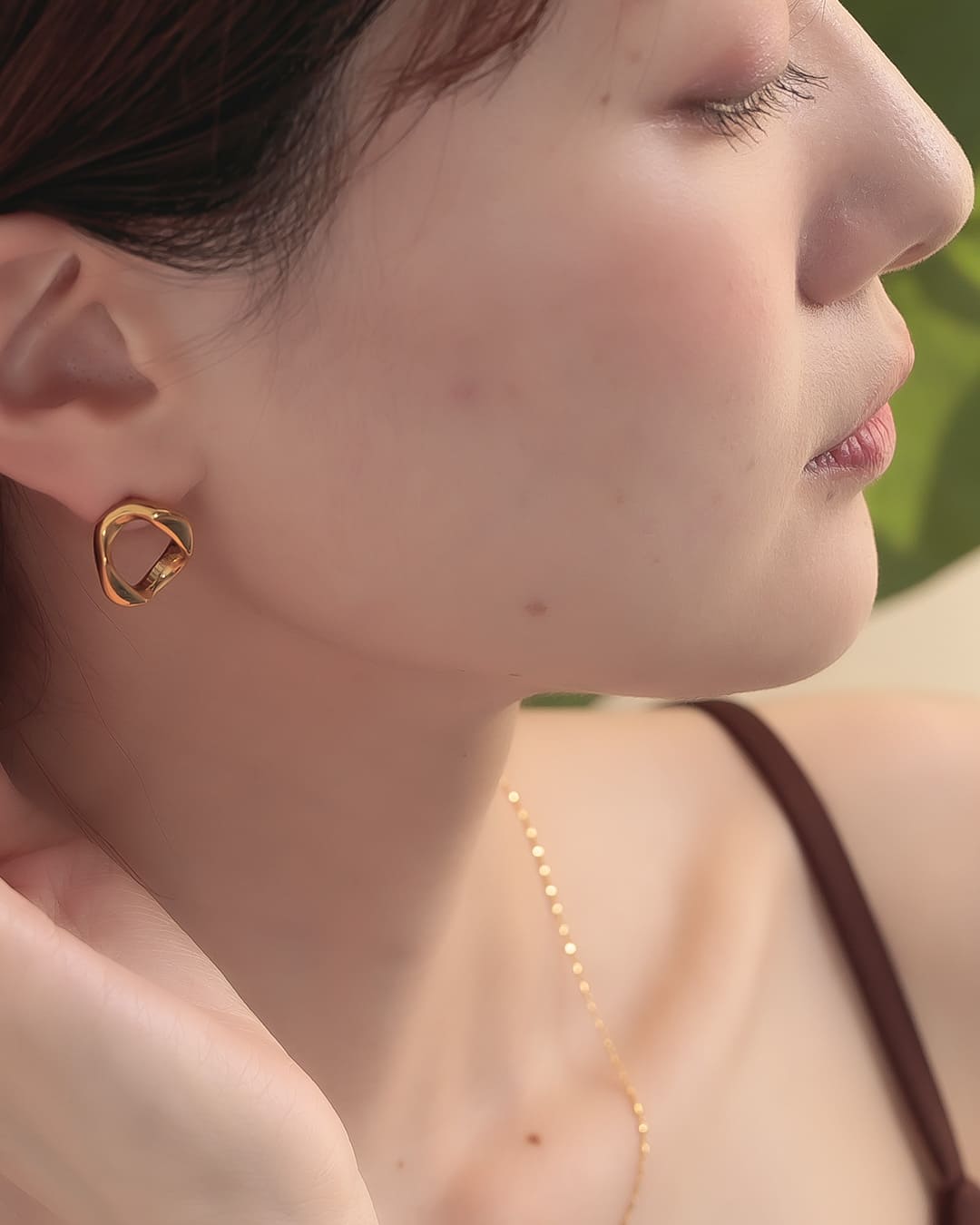 捻ったようなニュアンスデザインが特徴的なピアス。シンプルですが、耳元を印象的に飾ってくれます。