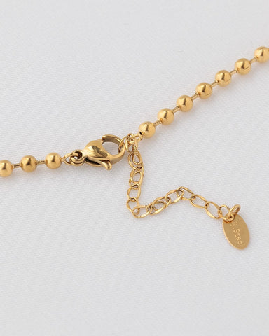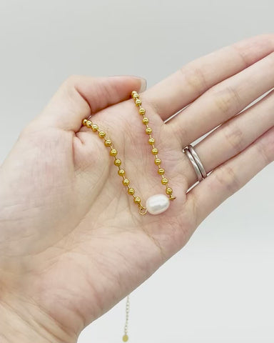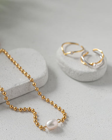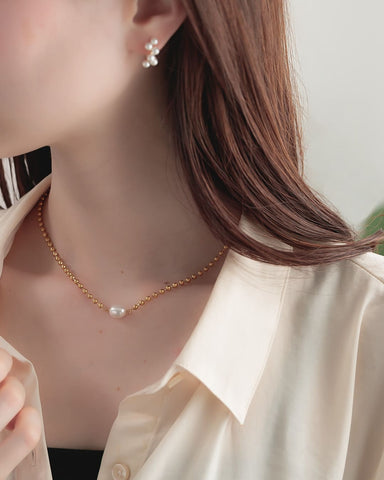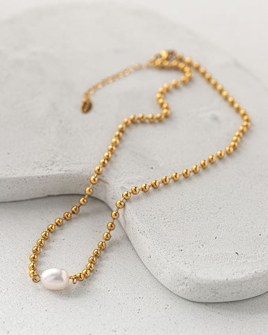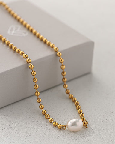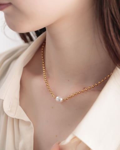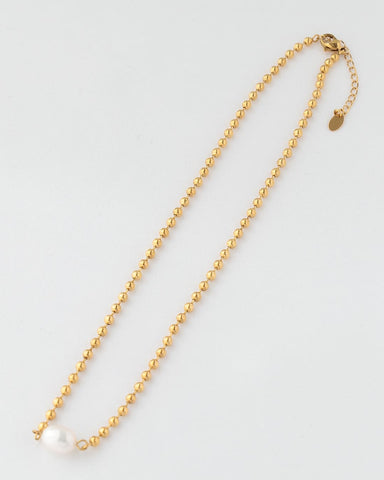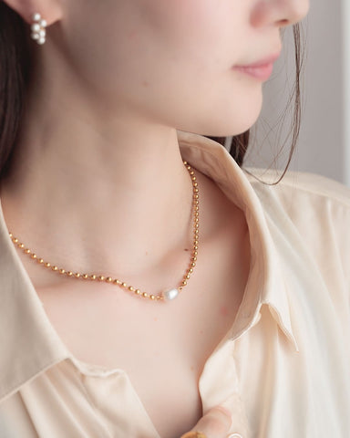 18Kコーティングを施したボールチェーンの中央に、1粒の淡水パールをあしらったネックレス。